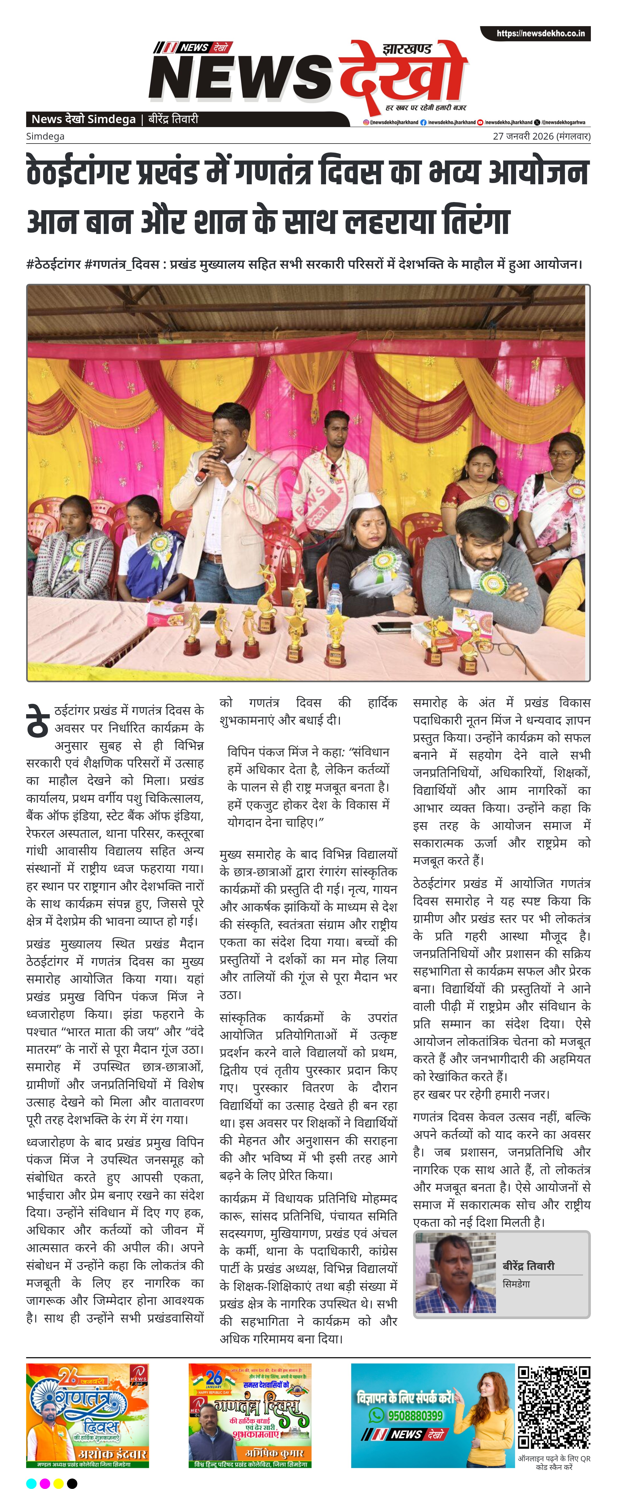 प्रखंड मुख्यालय स्थित प्रखंड मैदान ठेठईटांगर में गणतंत्र दिवस का मुख्य समारोह आयोजित किया गया। यहां प्रखंड प्रमुख विपिन पंकज मिंज ने ध्वजारोहण किया। झंडा फहराने के पश्चात “भारत माता की जय” और “वंदे मातरम” के नारों से पूरा मैदान गूंज उठा। समारोह में उपस्थित छात्र-छात्राओं, ग्रामीणों और जनप्रतिनिधियों में विशेष उत्साह देखने को मिला और वातावरण पूरी तरह देशभक्ति के रंग में रंग गया।