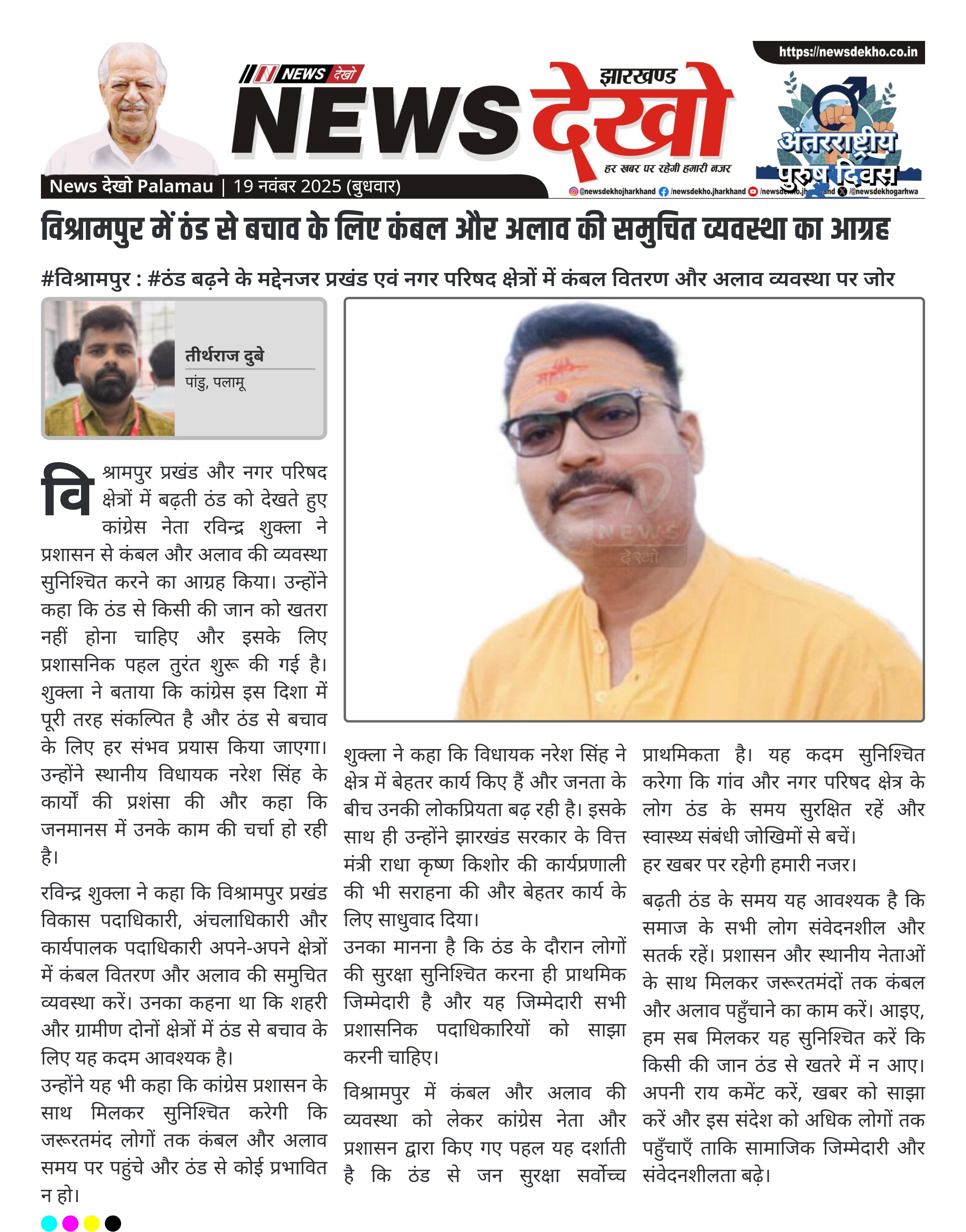 विश्रामपुर प्रखंड और नगर परिषद क्षेत्रों में बढ़ती ठंड को देखते हुए कांग्रेस नेता रविन्द्र शुक्ला ने प्रशासन से कंबल और अलाव की व्यवस्था सुनिश्चित करने का आग्रह किया। उन्होंने कहा कि ठंड से किसी की जान को खतरा नहीं होना चाहिए और इसके लिए प्रशासनिक पहल तुरंत शुरू की गई है। शुक्ला ने बताया कि कांग्रेस इस दिशा में पूरी तरह संकल्पित है और ठंड से बचाव के लिए हर संभव प्रयास किया जाएगा। उन्होंने स्थानीय विधायक नरेश सिंह के कार्यों की प्रशंसा की और कहा कि जनमानस में उनके काम की चर्चा हो रही है।