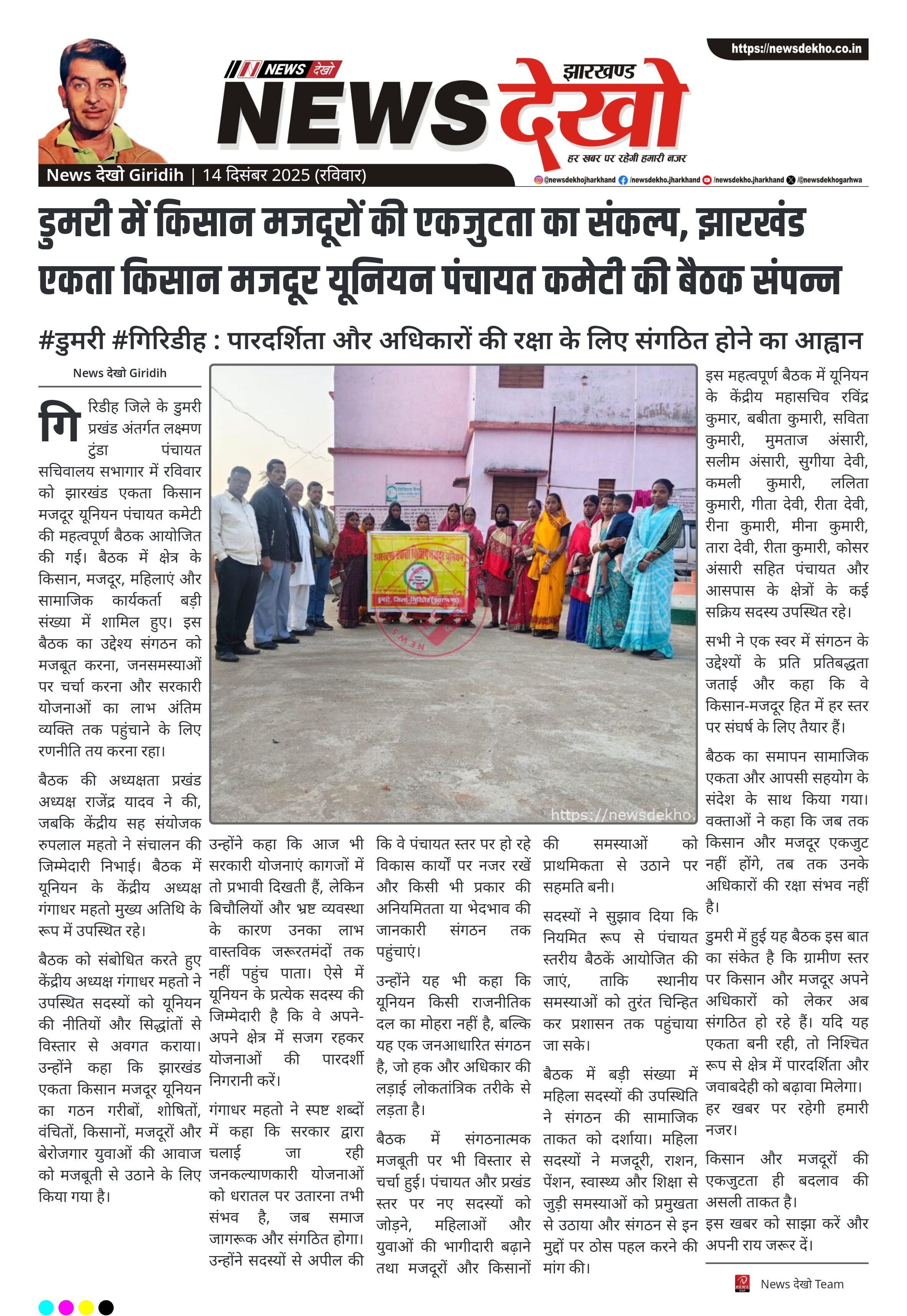 गिरिडीह जिले के डुमरी प्रखंड अंतर्गत लक्ष्मण टुंडा पंचायत सचिवालय सभागार में रविवार को झारखंड एकता किसान मजदूर यूनियन पंचायत कमेटी की महत्वपूर्ण बैठक आयोजित की गई। बैठक में क्षेत्र के किसान, मजदूर, महिलाएं और सामाजिक कार्यकर्ता बड़ी संख्या में शामिल हुए। इस बैठक का उद्देश्य संगठन को मजबूत करना, जनसमस्याओं पर चर्चा करना और सरकारी योजनाओं का लाभ अंतिम व्यक्ति तक पहुंचाने के लिए रणनीति तय करना रहा।