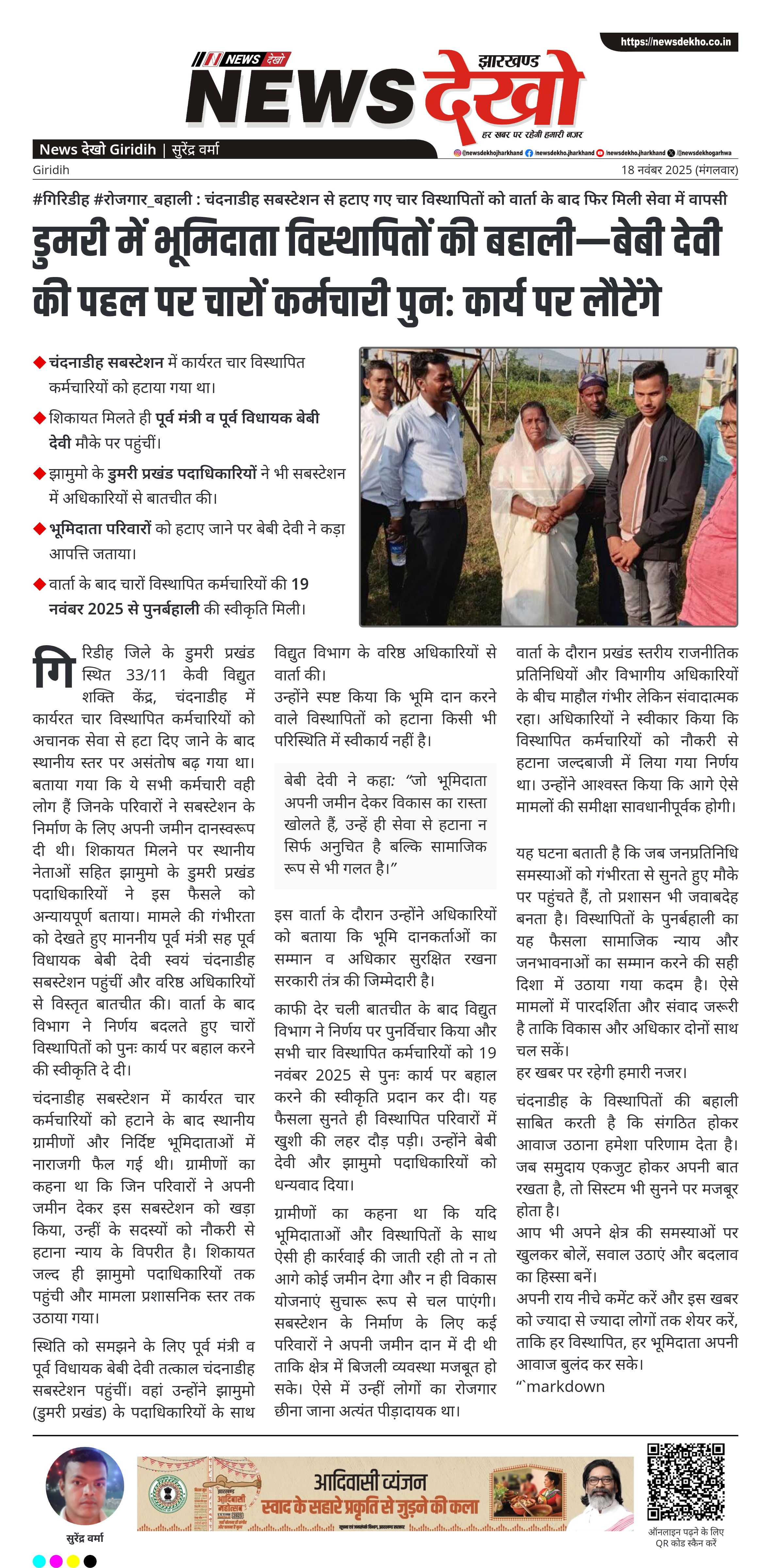 काफी देर चली बातचीत के बाद विद्युत विभाग ने निर्णय पर पुनर्विचार किया और सभी चार विस्थापित कर्मचारियों को 19 नवंबर 2025 से पुनः कार्य पर बहाल करने की स्वीकृति प्रदान कर दी। यह फैसला सुनते ही विस्थापित परिवारों में खुशी की लहर दौड़ पड़ी। उन्होंने बेबी देवी और झामुमो पदाधिकारियों को धन्यवाद दिया।