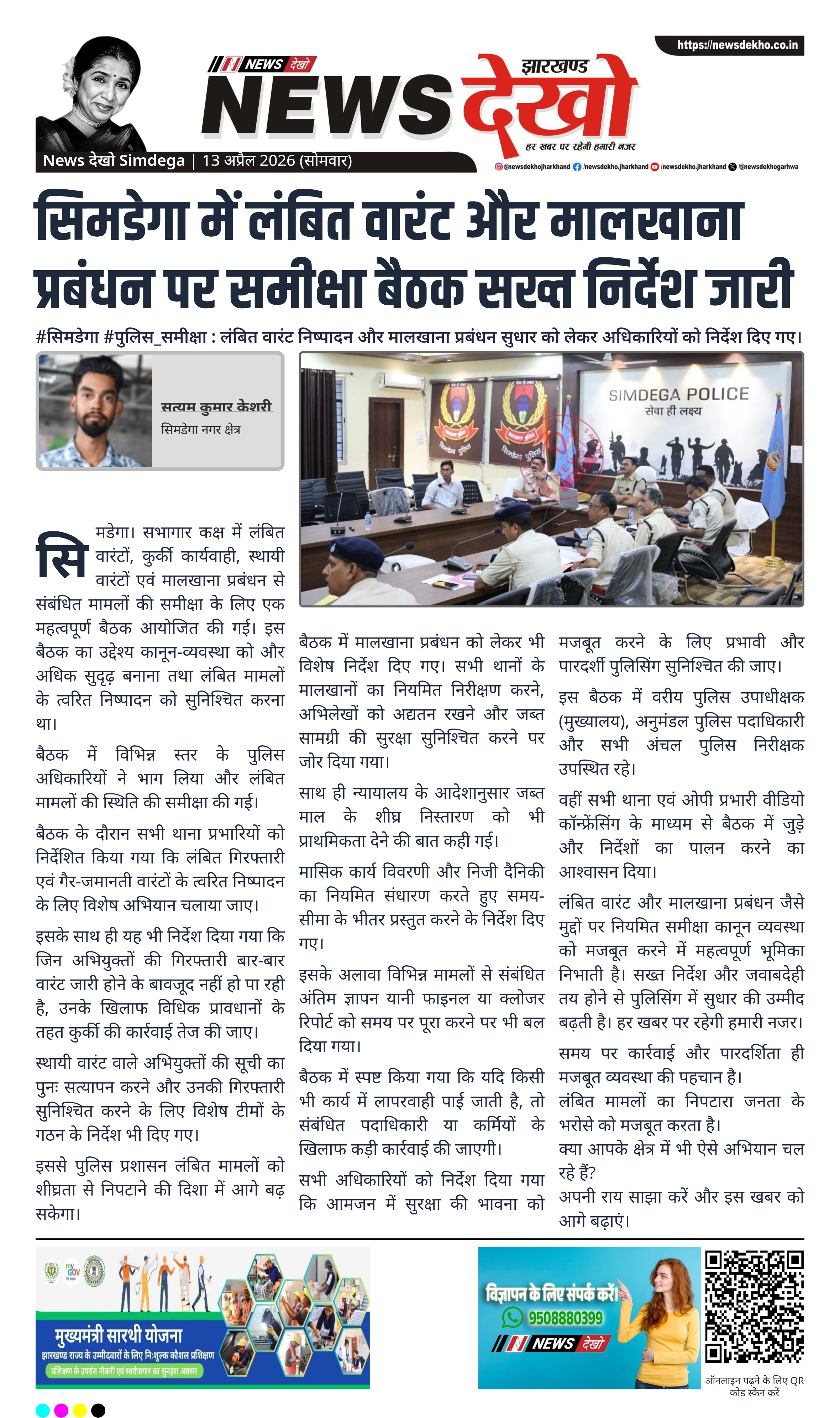 सिमडेगा। सभागार कक्ष में लंबित वारंटों, कुर्की कार्यवाही, स्थायी वारंटों एवं मालखाना प्रबंधन से संबंधित मामलों की समीक्षा के लिए एक महत्वपूर्ण बैठक आयोजित की गई। इस बैठक का उद्देश्य कानून-व्यवस्था को और अधिक सुदृढ़ बनाना तथा लंबित मामलों के त्वरित निष्पादन को सुनिश्चित करना था।