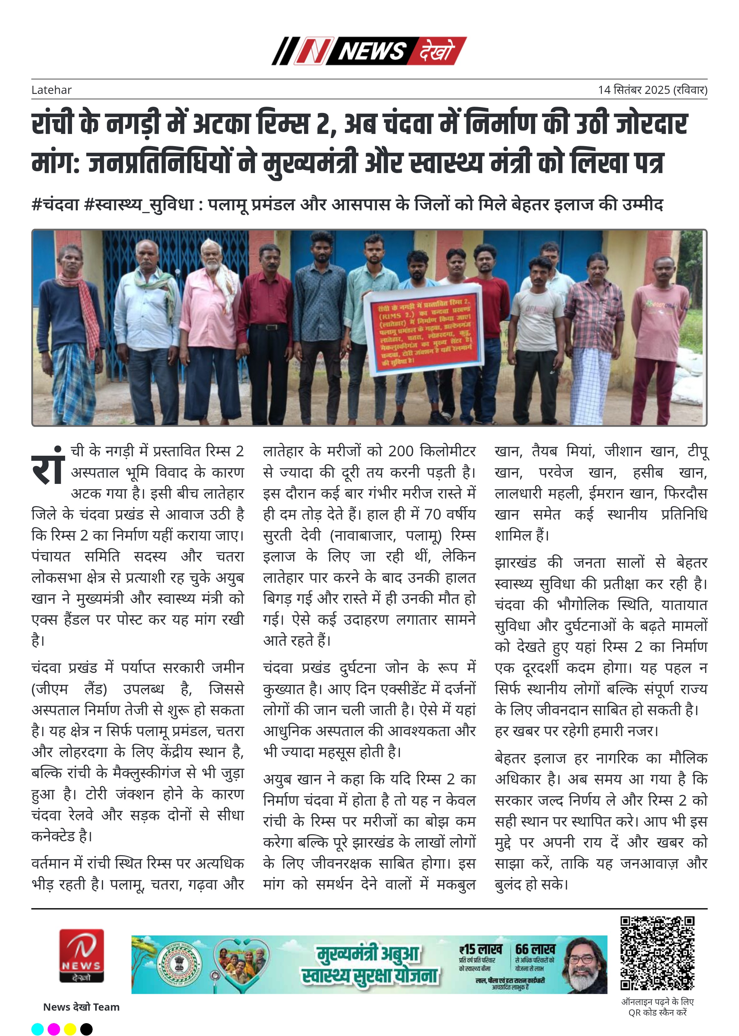 रांची के नगड़ी में प्रस्तावित रिम्स 2 अस्पताल भूमि विवाद के कारण अटक गया है। इसी बीच लातेहार जिले के चंदवा प्रखंड से आवाज उठी है कि रिम्स 2 का निर्माण यहीं कराया जाए। पंचायत समिति सदस्य और चतरा लोकसभा क्षेत्र से प्रत्याशी रह चुके अयुब खान ने मुख्यमंत्री और स्वास्थ्य मंत्री को एक्स हैंडल पर पोस्ट कर यह मांग रखी है।
