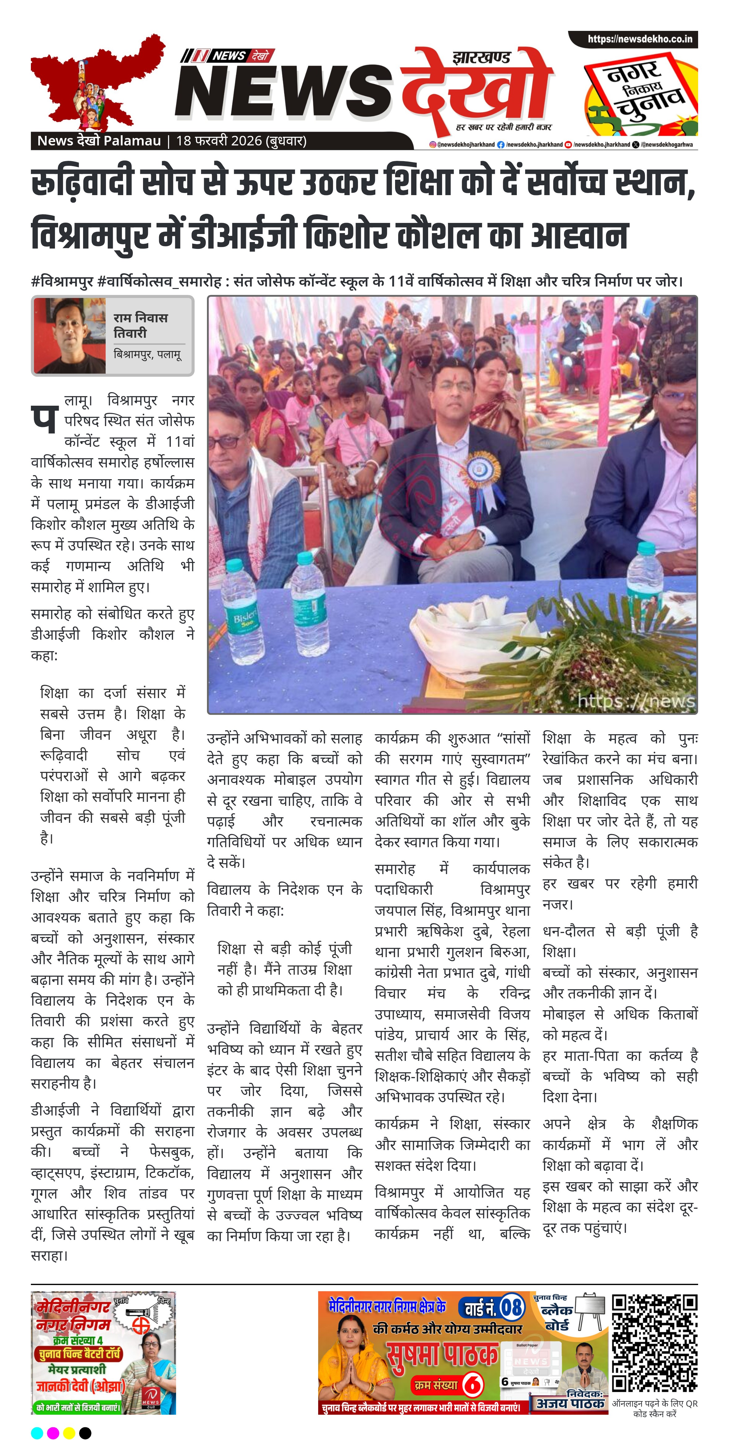 विश्रामपुर नगर परिषद स्थित संत जोसेफ कॉन्वेंट स्कूल के 11वें वार्षिकोत्सव में पलामू प्रमंडल के डीआईजी किशोर कौशल ने मुख्य अतिथि के रूप में शिक्षा के महत्व पर प्रकाश डाला। उन्होंने कहा कि शिक्षा से बड़ी कोई पूंजी नहीं होती और रूढ़िवादी सोच से मुक्त होकर समाज को महानता की ओर बढ़ना चाहिए। कार्यक्रम में विद्यार्थियों ने रंगारंग प्रस्तुतियां दीं।