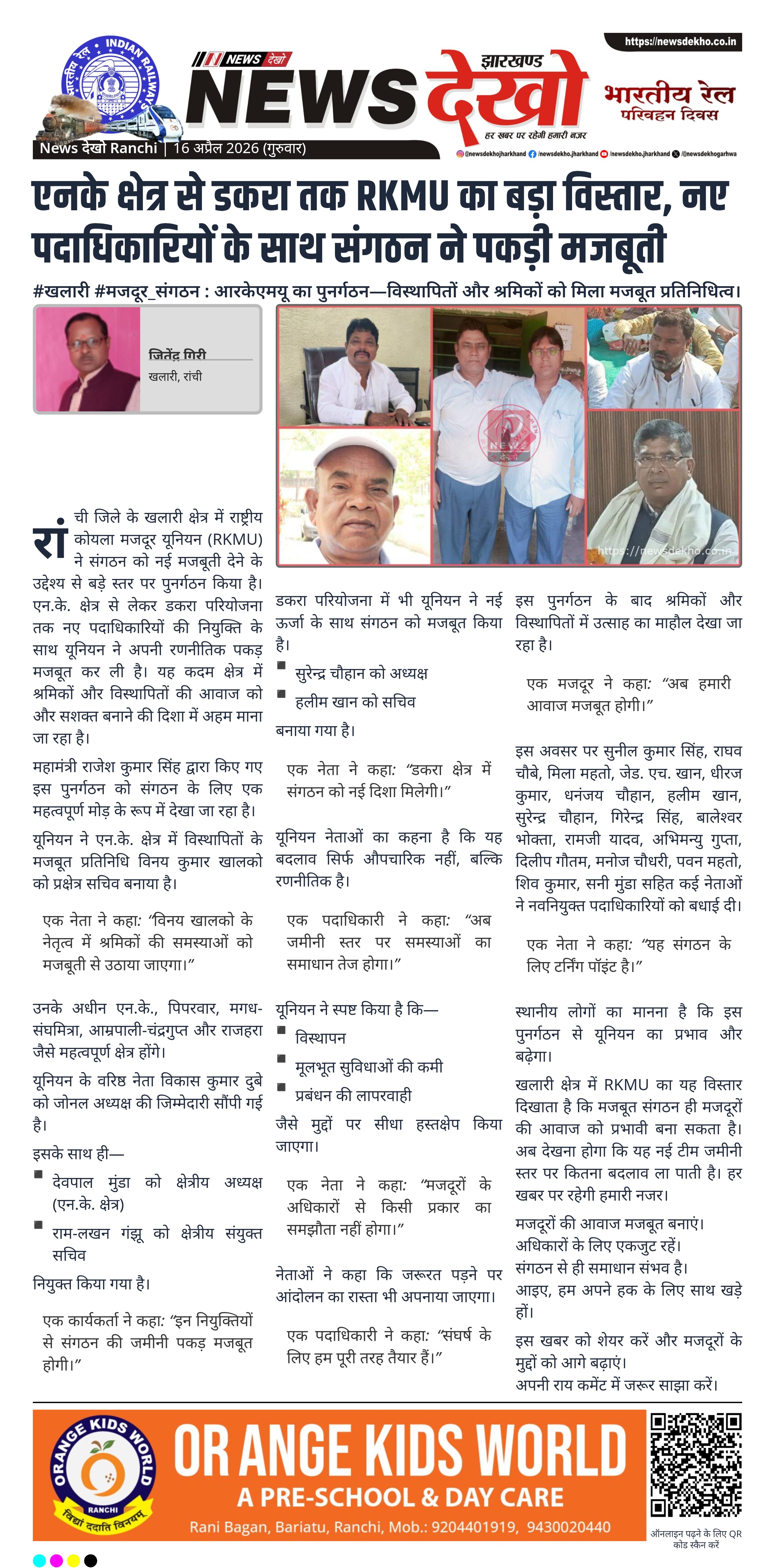 रांची जिले के खलारी क्षेत्र में राष्ट्रीय कोयला मजदूर यूनियन (RKMU) ने संगठन को नई मजबूती देने के उद्देश्य से बड़े स्तर पर पुनर्गठन किया है। एन.के. क्षेत्र से लेकर डकरा परियोजना तक नए पदाधिकारियों की नियुक्ति के साथ यूनियन ने अपनी रणनीतिक पकड़ मजबूत कर ली है। यह कदम क्षेत्र में श्रमिकों और विस्थापितों की आवाज को और सशक्त बनाने की दिशा में अहम माना जा रहा है।