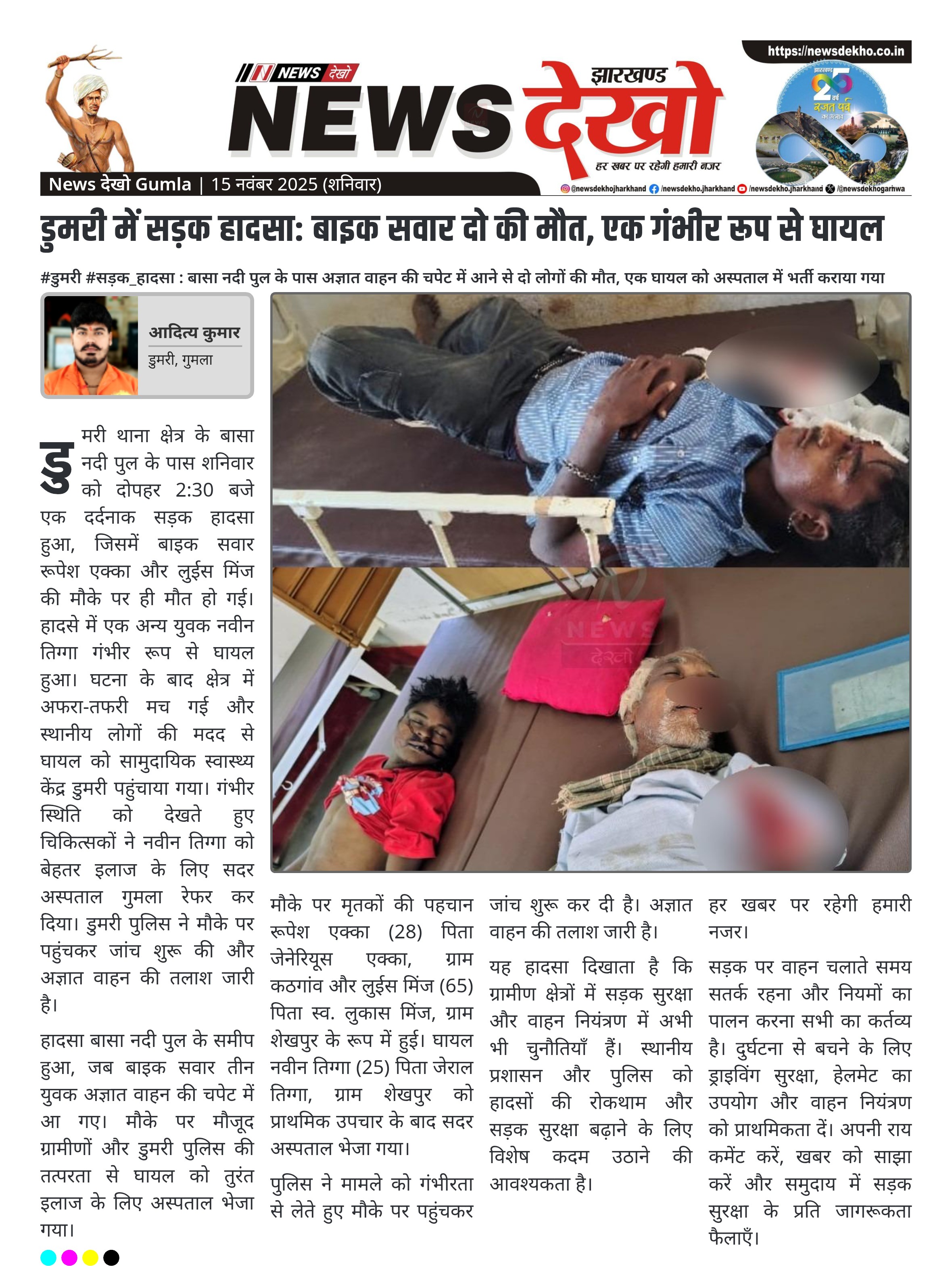 - डुमरी थाना क्षेत्र के बासा नदी पुल के पास सड़क हादसे में दो बाइक सवारों की मौत हुई।