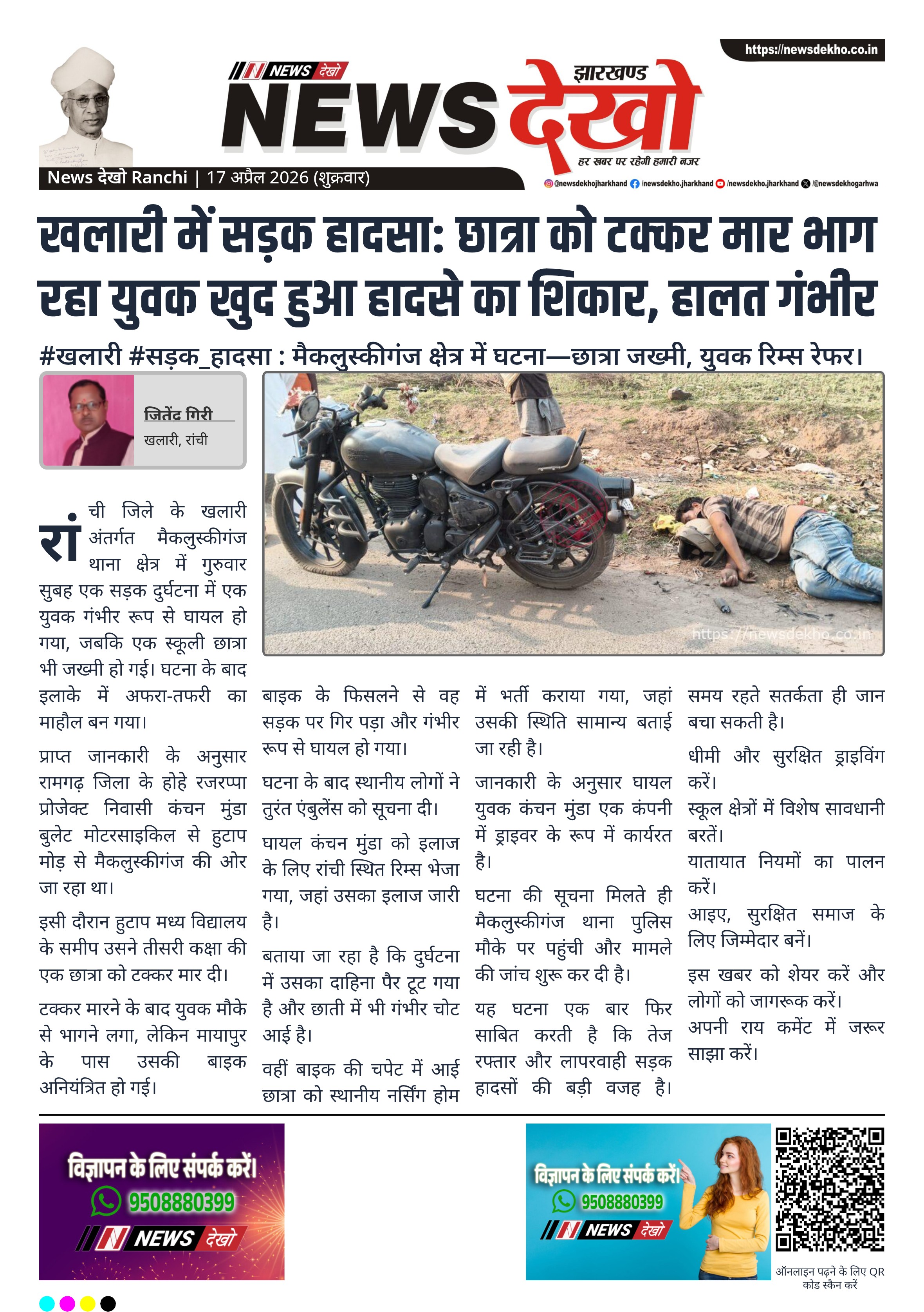 #खलारी #सड़क_हादसा : मैकलुस्कीगंज क्षेत्र में घटना—छात्रा जख्मी, युवक रिम्स रेफर।