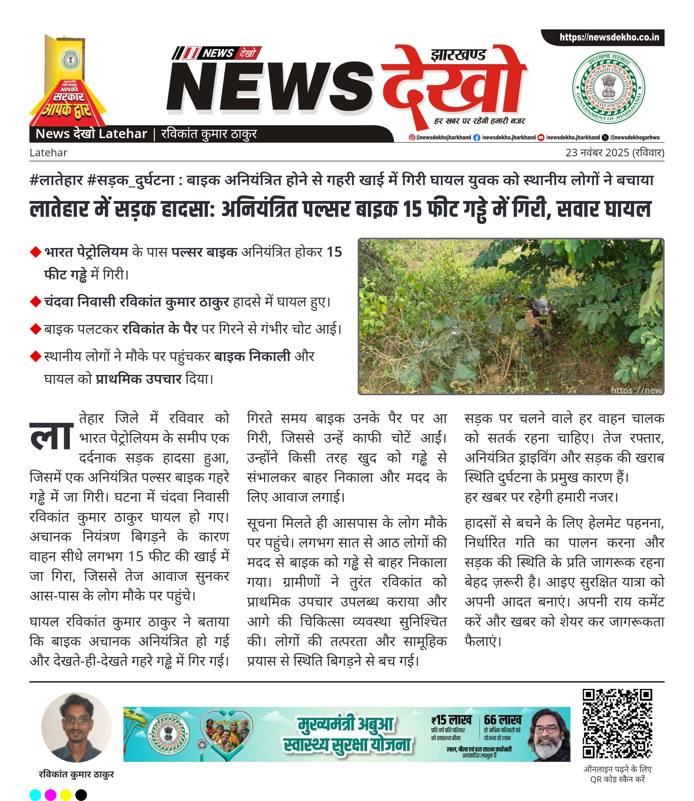 लातेहार जिले में रविवार को भारत पेट्रोलियम के समीप एक दर्दनाक सड़क हादसा हुआ, जिसमें एक अनियंत्रित पल्सर बाइक गहरे गड्ढे में जा गिरी। घटना में चंदवा निवासी रविकांत कुमार ठाकुर घायल हो गए। अचानक नियंत्रण बिगड़ने के कारण वाहन सीधे लगभग 15 फीट की खाई में जा गिरा, जिससे तेज आवाज सुनकर आस-पास के लोग मौके पर पहुंचे।