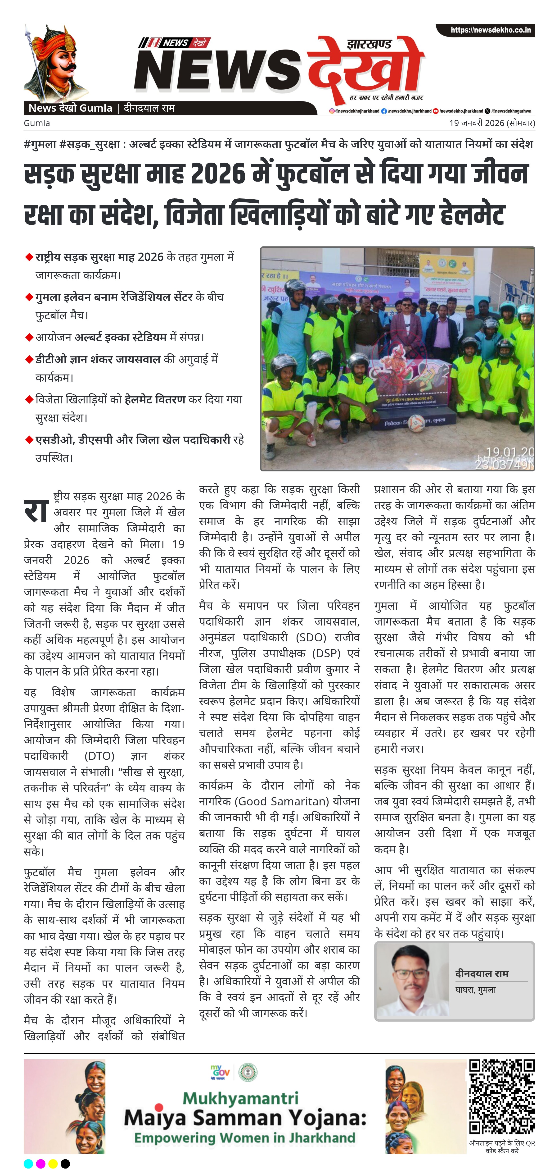 राष्ट्रीय सड़क सुरक्षा माह 2026 के अवसर पर गुमला जिले में खेल और सामाजिक जिम्मेदारी का प्रेरक उदाहरण देखने को मिला। 19 जनवरी 2026 को अल्बर्ट इक्का स्टेडियम में आयोजित फुटबॉल जागरूकता मैच ने युवाओं और दर्शकों को यह संदेश दिया कि मैदान में जीत जितनी जरूरी है, सड़क पर सुरक्षा उससे कहीं अधिक महत्वपूर्ण है। इस आयोजन का उद्देश्य आमजन को यातायात नियमों के पालन के प्रति प्रेरित करना रहा।
