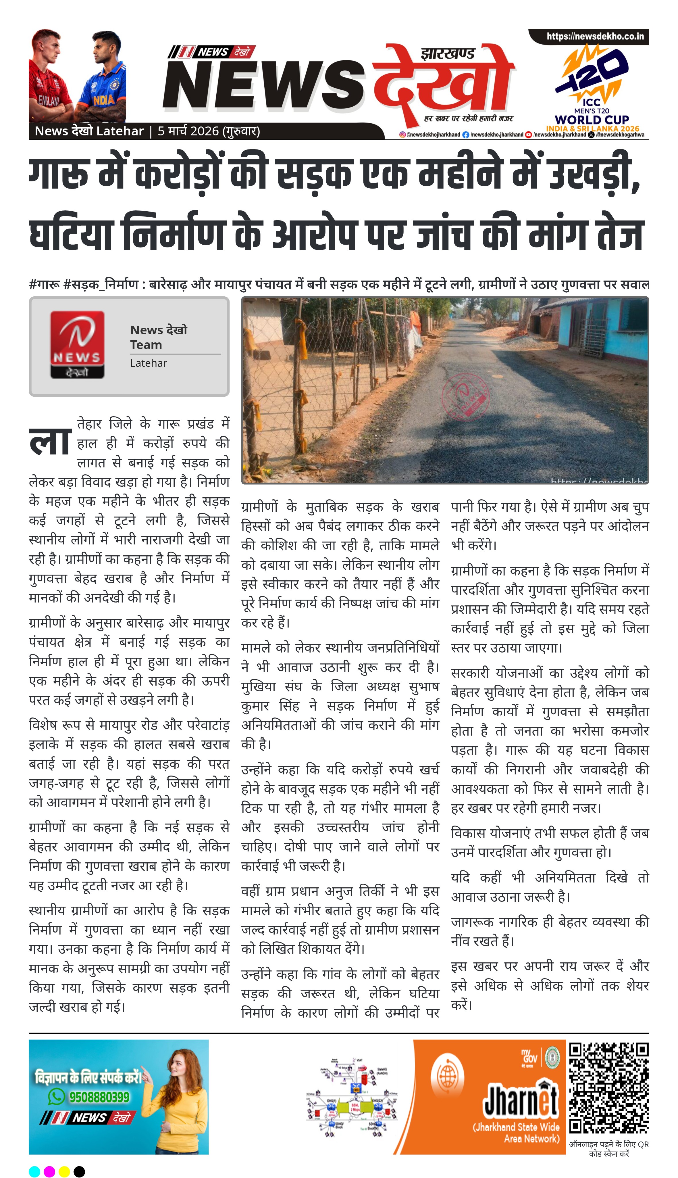 लातेहार जिले के गारू प्रखंड में हाल ही में करोड़ों रुपये की लागत से बनी सड़क के एक महीने के भीतर ही टूटने की खबर से ग्रामीणों में आक्रोश बढ़ गया है। बारेसाढ़ और मायापुर पंचायत के कई हिस्सों में सड़क की ऊपरी परत उखड़ने लगी है। ग्रामीणों ने निर्माण कार्य में घटिया सामग्री के उपयोग का आरोप लगाते हुए मामले की जांच की मांग की है।