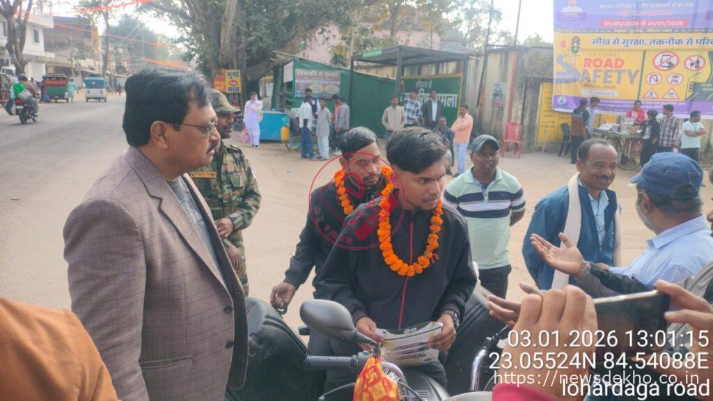 राष्ट्रीय सड़क सुरक्षा माह 2026 के तहत गुमला में शनिवार को परिवहन विभाग और जिला प्रशासन ने अनोखा जागरूकता अभियान चलाया। इस दौरान हेलमेट पहनकर वाहन चलाने वालों को गुलाब का फूल देकर सम्मानित किया गया, जबकि बिना हेलमेट चलने वालों को प्रतीकात्मक रूप से माला पहनाकर नियमों का महत्व समझाया गया। अभियान का उद्देश्य चालान काटना नहीं, बल्कि चालकों में सुरक्षा के प्रति जिम्मेदारी पैदा करना रहा। इस पहल ने सड़क सुरक्षा को लेकर आम लोगों के बीच सकारात्मक चर्चा को जन्म दिया।