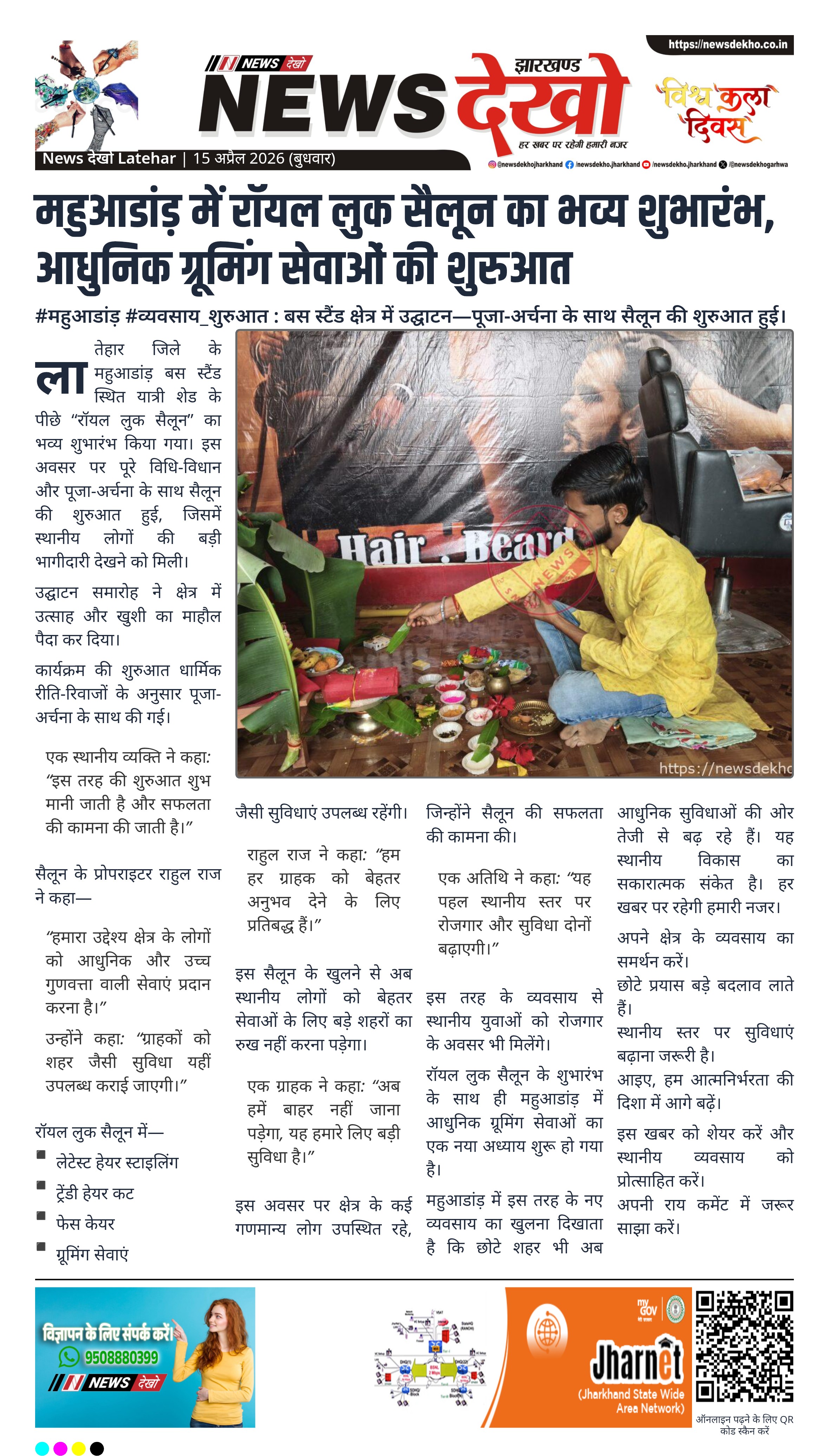 लातेहार जिले के महुआडांड़ बस स्टैंड स्थित यात्री शेड के पीछे “रॉयल लुक सैलून” का भव्य शुभारंभ किया गया। इस अवसर पर पूरे विधि-विधान और पूजा-अर्चना के साथ सैलून की शुरुआत हुई, जिसमें स्थानीय लोगों की बड़ी भागीदारी देखने को मिली।
