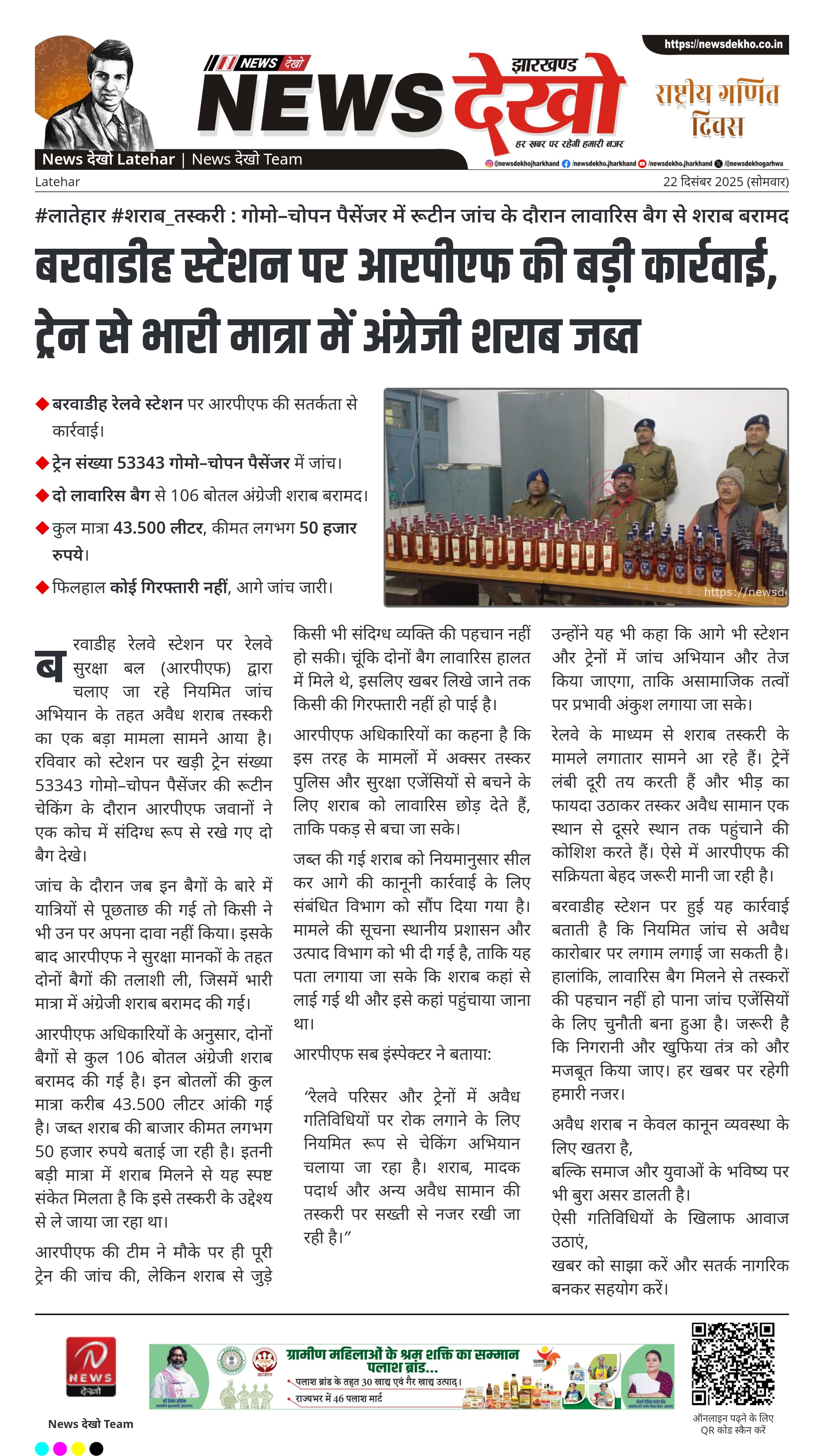 लातेहार जिले के बरवाडीह रेलवे स्टेशन पर आरपीएफ ने रूटीन चेकिंग के दौरान बड़ी कार्रवाई की है। गोमो–चोपन पैसेंजर ट्रेन के एक कोच से लावारिस हालत में दो बैग बरामद किए गए, जिनमें भारी मात्रा में अंग्रेजी शराब पाई गई। कुल 106 बोतलें जब्त की गई हैं, जिनकी अनुमानित कीमत करीब 50 हजार रुपये बताई जा रही है। मामले में शराब तस्करी की आशंका जताई जा रही है।