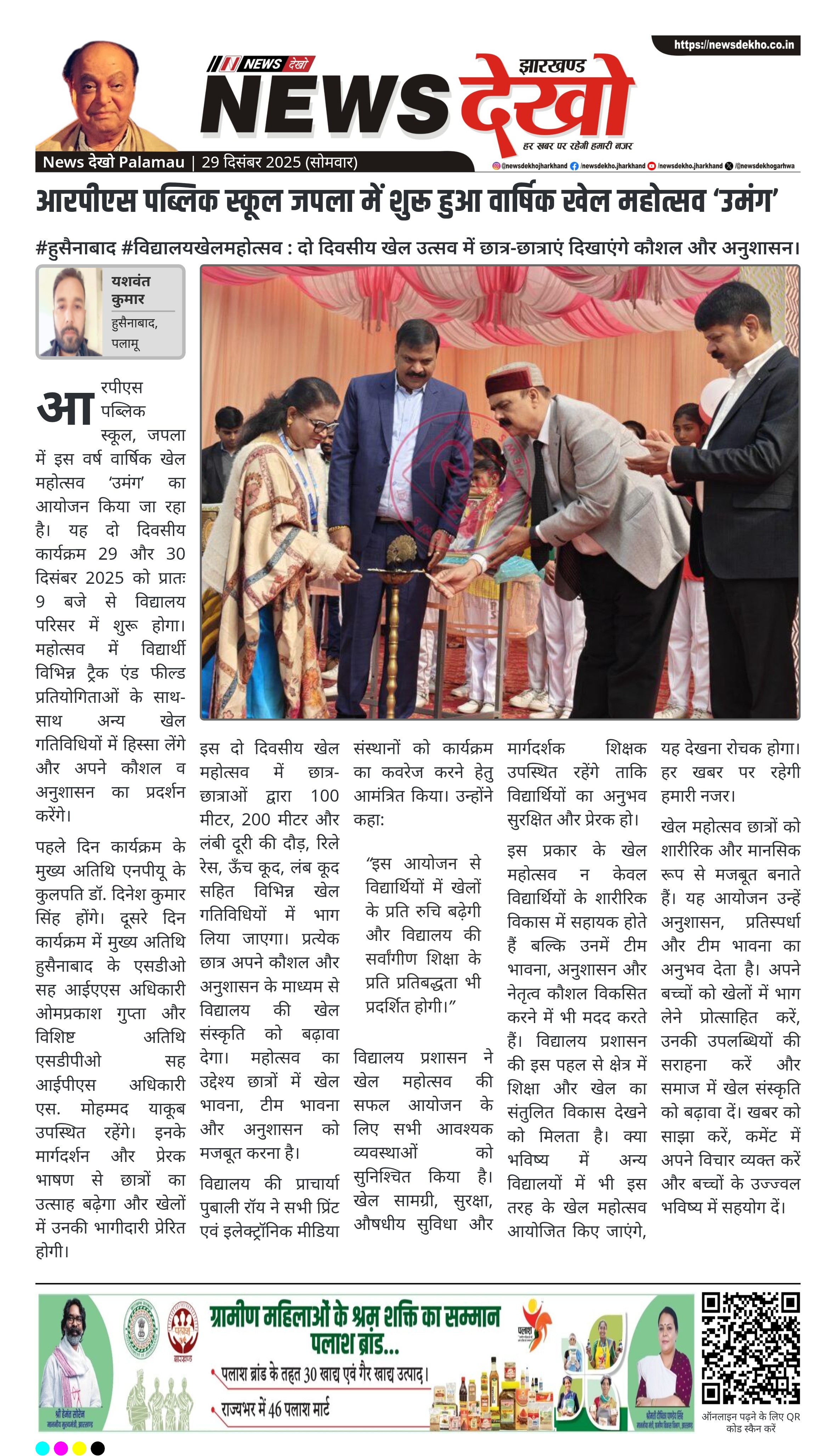 - आरपीएस पब्लिक स्कूल, जपला में 29 एवं 30 दिसंबर को खेल महोत्सव ‘उमंग’।