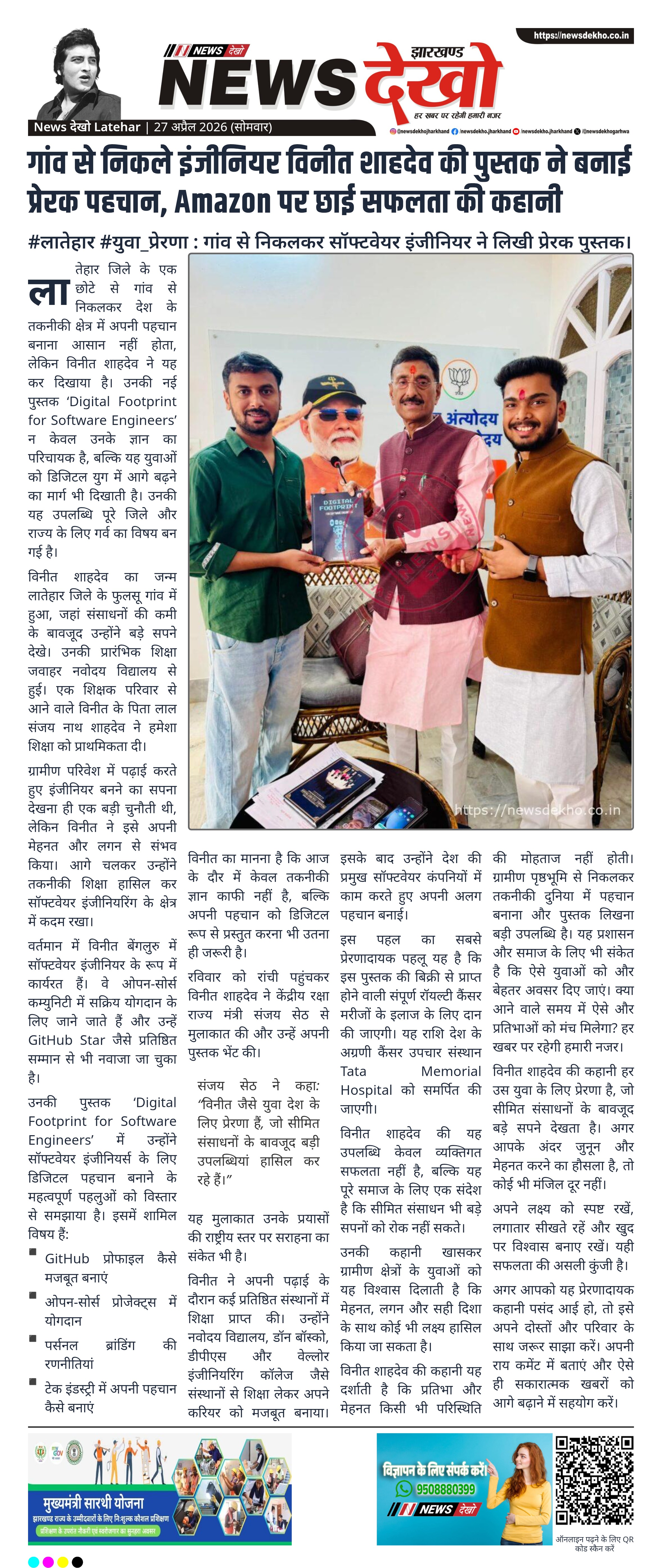 लातेहार जिले के फुलसू गांव के रहने वाले सॉफ्टवेयर इंजीनियर विनीत शाहदेव ने अपनी पुस्तक ‘Digital Footprint for Software Engineers’ प्रकाशित की है, जो अब Amazon पर उपलब्ध है। सीमित संसाधनों के बीच पले-बढ़े विनीत ने अपनी मेहनत से तकनीकी क्षेत्र में पहचान बनाई। उनकी यह पुस्तक डिजिटल पहचान और करियर विकास पर केंद्रित है। यह उपलब्धि युवाओं के लिए प्रेरणादायक उदाहरण बनकर उभरी है।