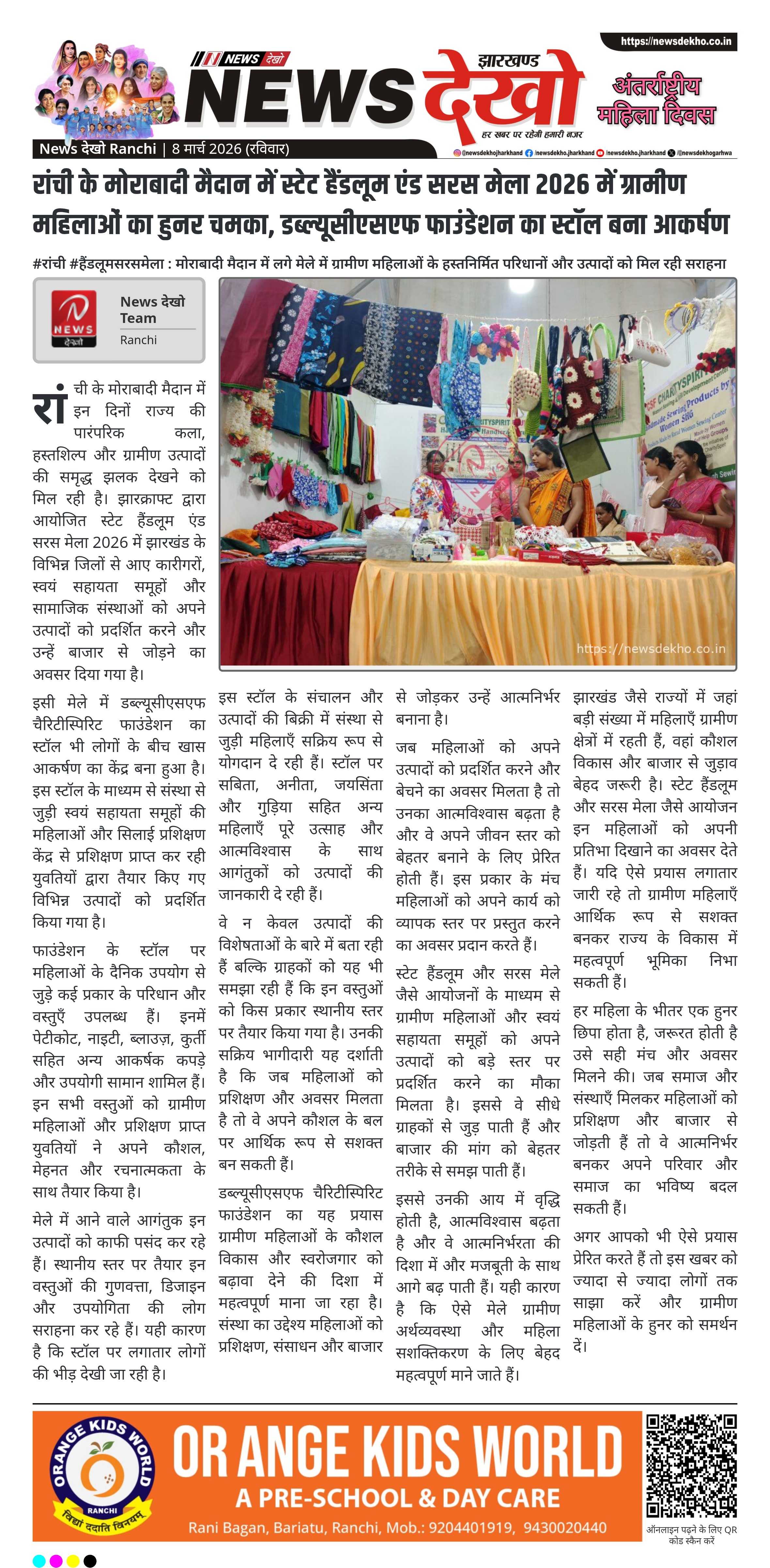 रांची के मोराबादी मैदान में आयोजित स्टेट हैंडलूम एंड सरस मेला 2026 में झारखंड की पारंपरिक कला और ग्रामीण महिलाओं के कौशल की झलक देखने को मिल रही है। झारक्राफ्ट द्वारा आयोजित इस मेले में डब्ल्यूसीएसएफ चैरिटीस्पिरिट फाउंडेशन का स्टॉल विशेष आकर्षण का केंद्र बना हुआ है, जहां स्वयं सहायता समूहों की महिलाओं और प्रशिक्षण प्राप्त युवतियों द्वारा तैयार उत्पादों को प्रदर्शित किया गया है।