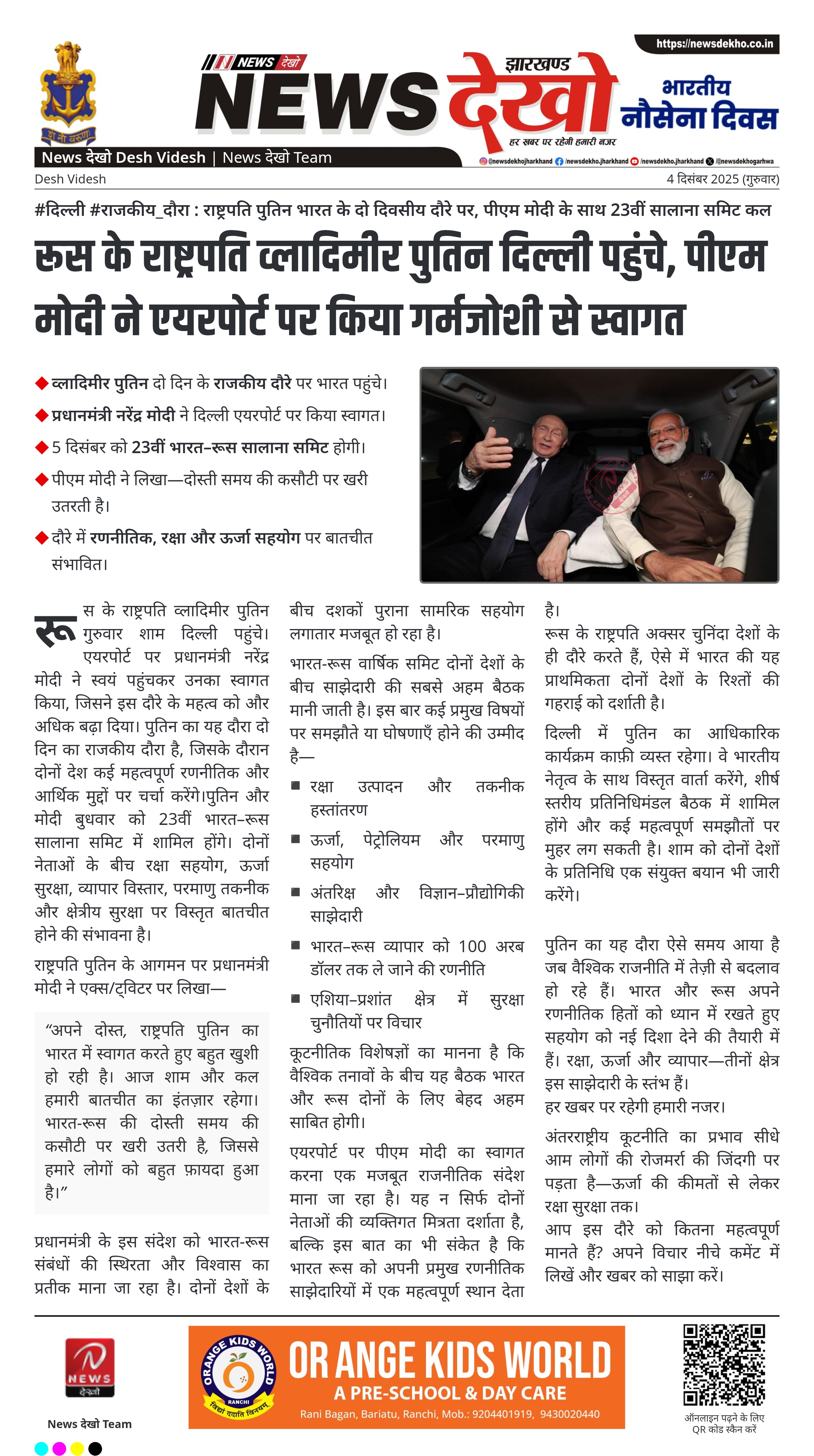 - व्लादिमीर पुतिन दो दिन के राजकीय दौरे पर भारत पहुंचे।