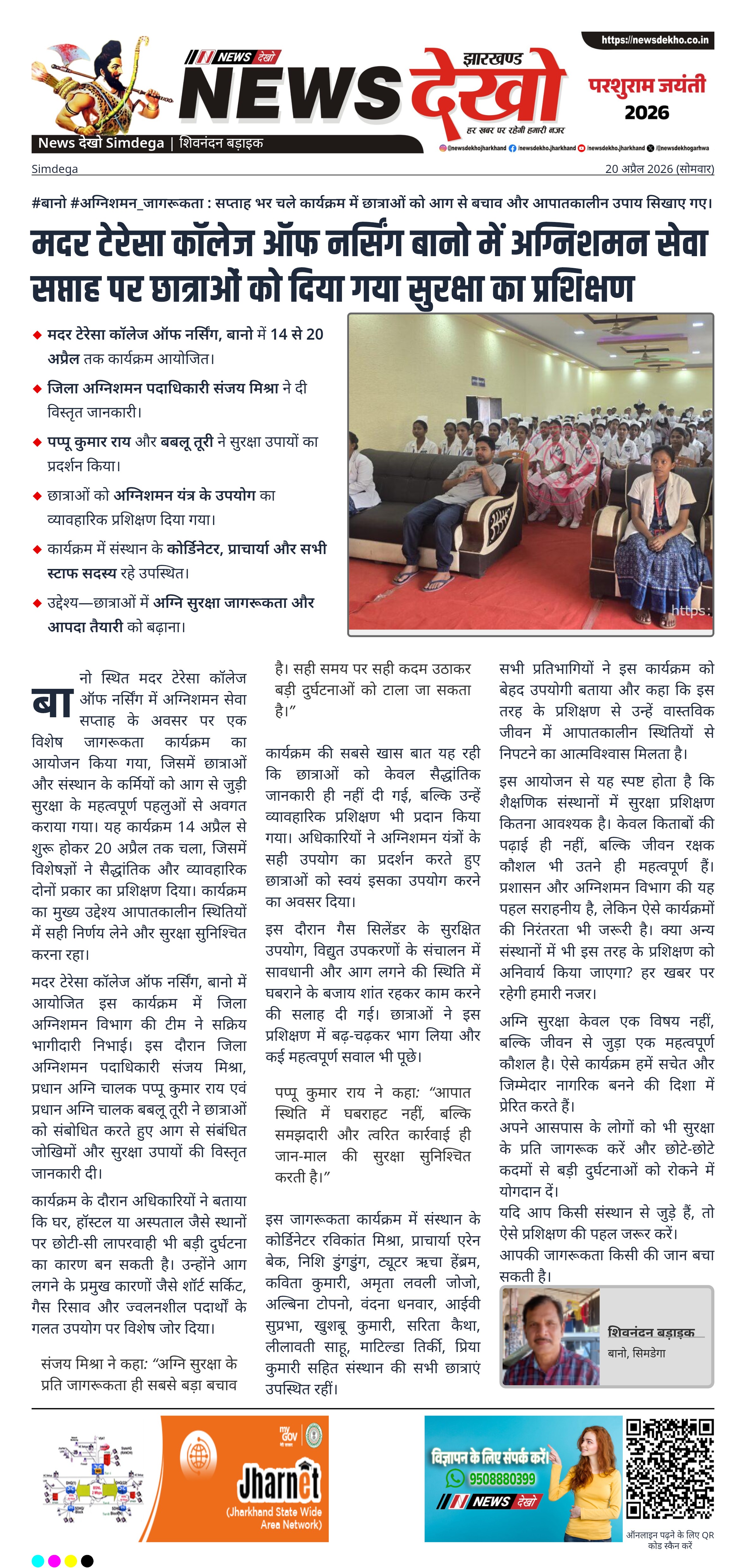 मदर टेरेसा कॉलेज ऑफ नर्सिंग, बानो में आयोजित इस कार्यक्रम में जिला अग्निशमन विभाग की टीम ने सक्रिय भागीदारी निभाई। इस दौरान जिला अग्निशमन पदाधिकारी संजय मिश्रा, प्रधान अग्नि चालक पप्पू कुमार राय एवं प्रधान अग्नि चालक बबलू तूरी ने छात्राओं को संबोधित करते हुए आग से संबंधित जोखिमों और सुरक्षा उपायों की विस्तृत जानकारी दी।