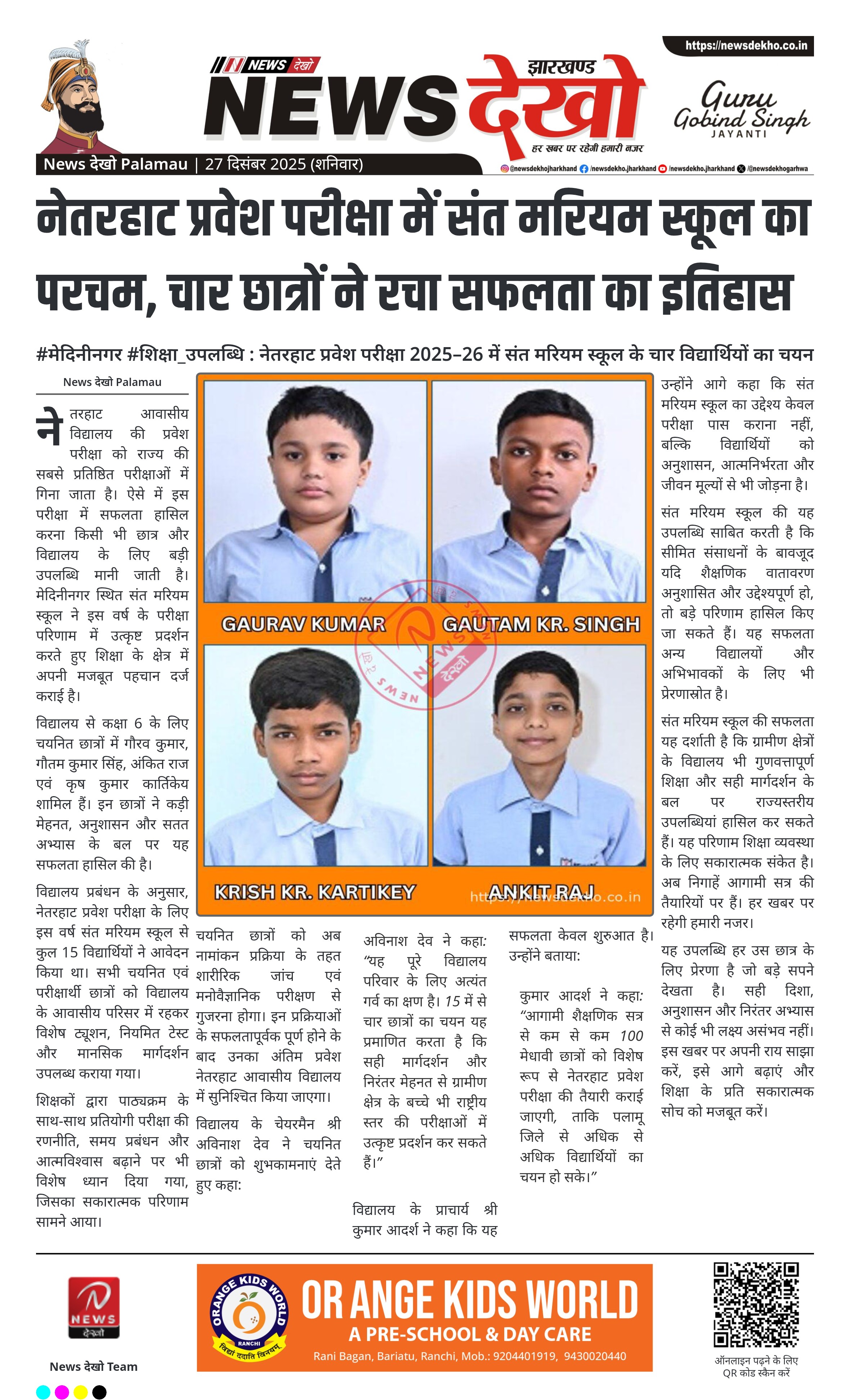 #मेदिनीनगर #शिक्षा_उपलब्धि : नेतरहाट प्रवेश परीक्षा 2025–26 में संत मरियम स्कूल के चार विद्यार्थियों का चयन।