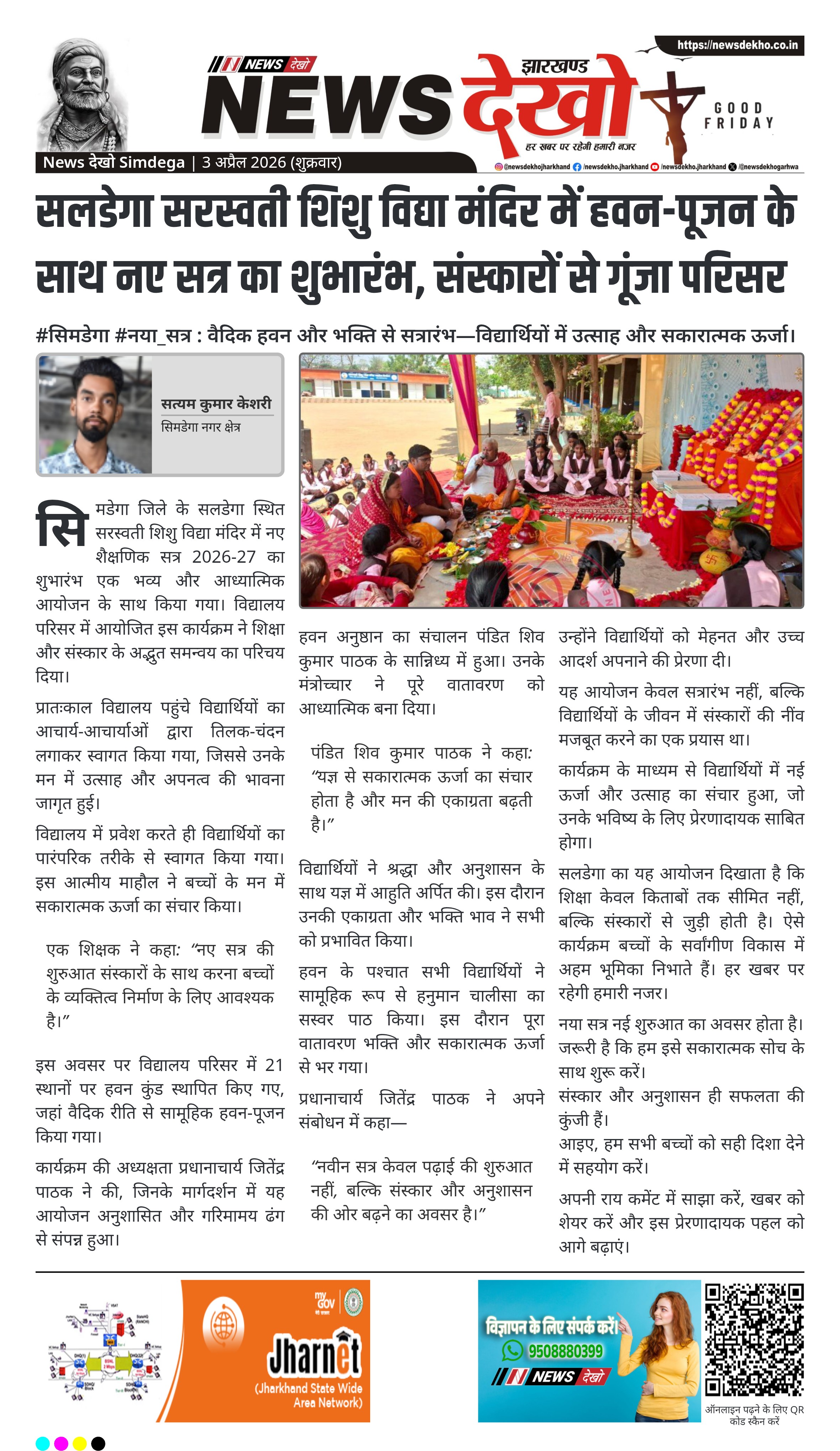 सिमडेगा जिले के सलडेगा स्थित सरस्वती शिशु विद्या मंदिर में नए शैक्षणिक सत्र 2026-27 का शुभारंभ एक भव्य और आध्यात्मिक आयोजन के साथ किया गया। विद्यालय परिसर में आयोजित इस कार्यक्रम ने शिक्षा और संस्कार के अद्भुत समन्वय का परिचय दिया।