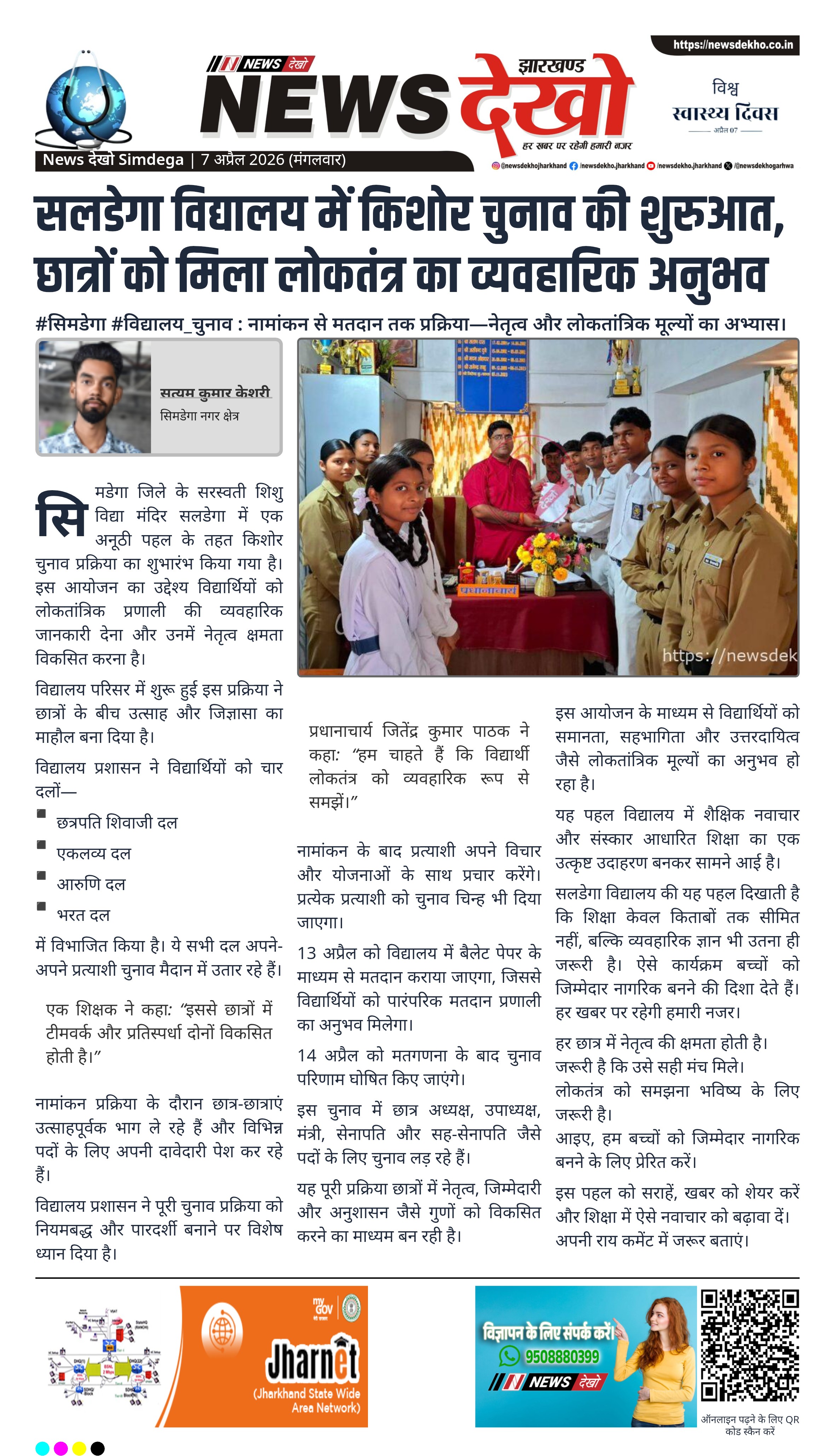 सिमडेगा जिले के सरस्वती शिशु विद्या मंदिर सलडेगा में एक अनूठी पहल के तहत किशोर चुनाव प्रक्रिया का शुभारंभ किया गया है। इस आयोजन का उद्देश्य विद्यार्थियों को लोकतांत्रिक प्रणाली की व्यवहारिक जानकारी देना और उनमें नेतृत्व क्षमता विकसित करना है।