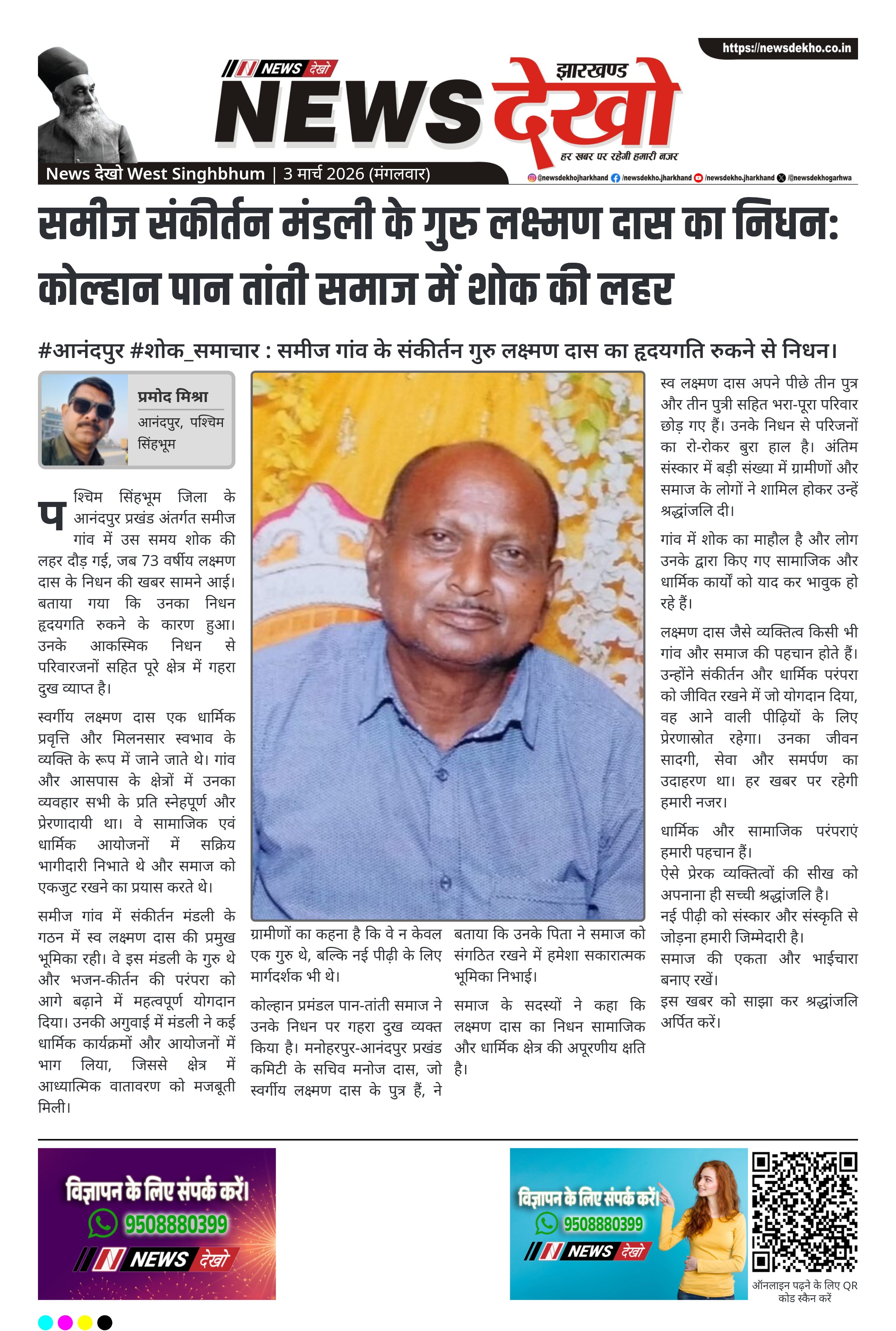 पश्चिम सिंहभूम जिला के आनंदपुर प्रखंड अंतर्गत समीज गांव में उस समय शोक की लहर दौड़ गई, जब 73 वर्षीय लक्ष्मण दास के निधन की खबर सामने आई। बताया गया कि उनका निधन हृदयगति रुकने के कारण हुआ। उनके आकस्मिक निधन से परिवारजनों सहित पूरे क्षेत्र में गहरा दुख व्याप्त है।