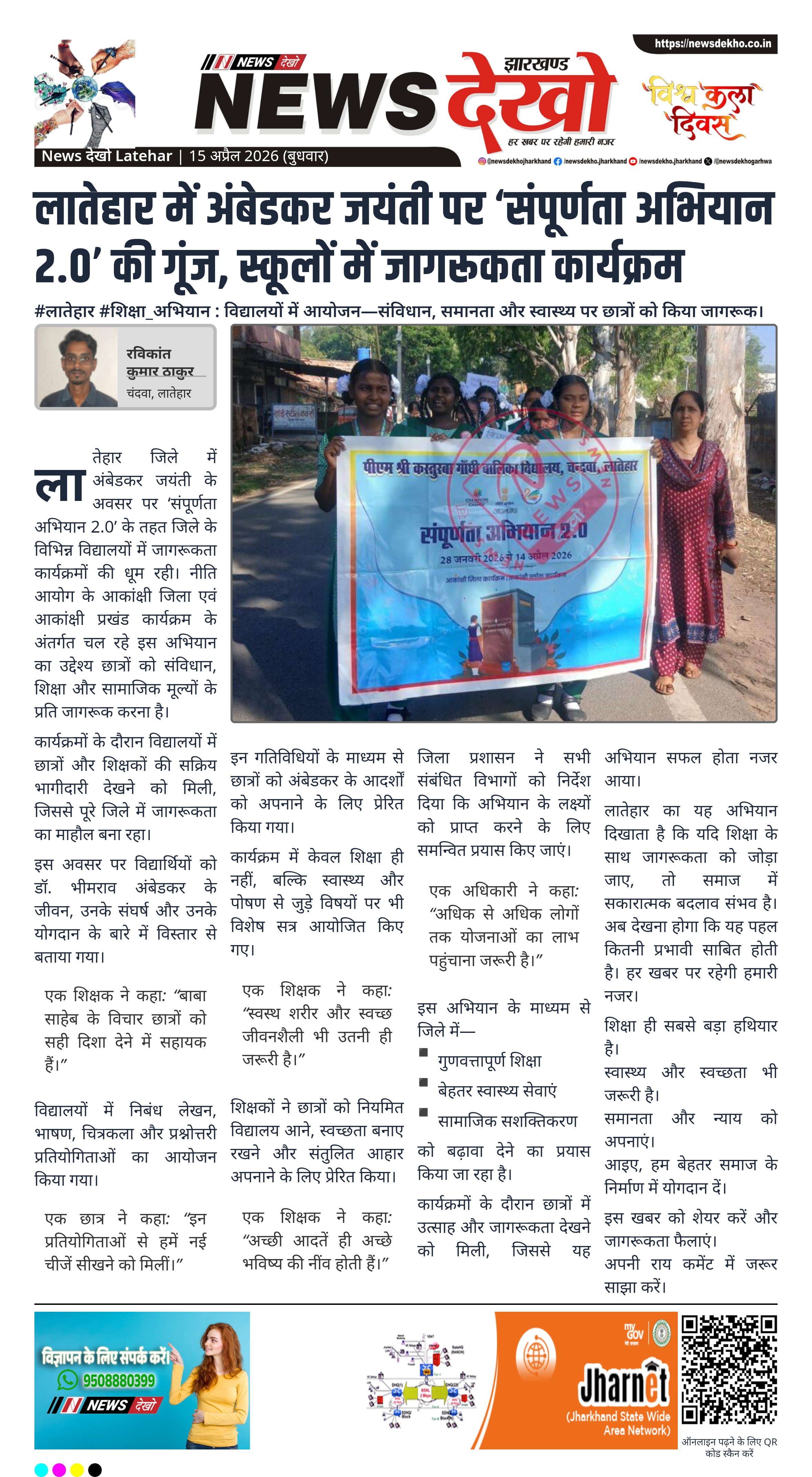 लातेहार जिले में अंबेडकर जयंती के अवसर पर ‘संपूर्णता अभियान 2.0’ के तहत जिले के विभिन्न विद्यालयों में जागरूकता कार्यक्रमों की धूम रही। नीति आयोग के आकांक्षी जिला एवं आकांक्षी प्रखंड कार्यक्रम के अंतर्गत चल रहे इस अभियान का उद्देश्य छात्रों को संविधान, शिक्षा और सामाजिक मूल्यों के प्रति जागरूक करना है।