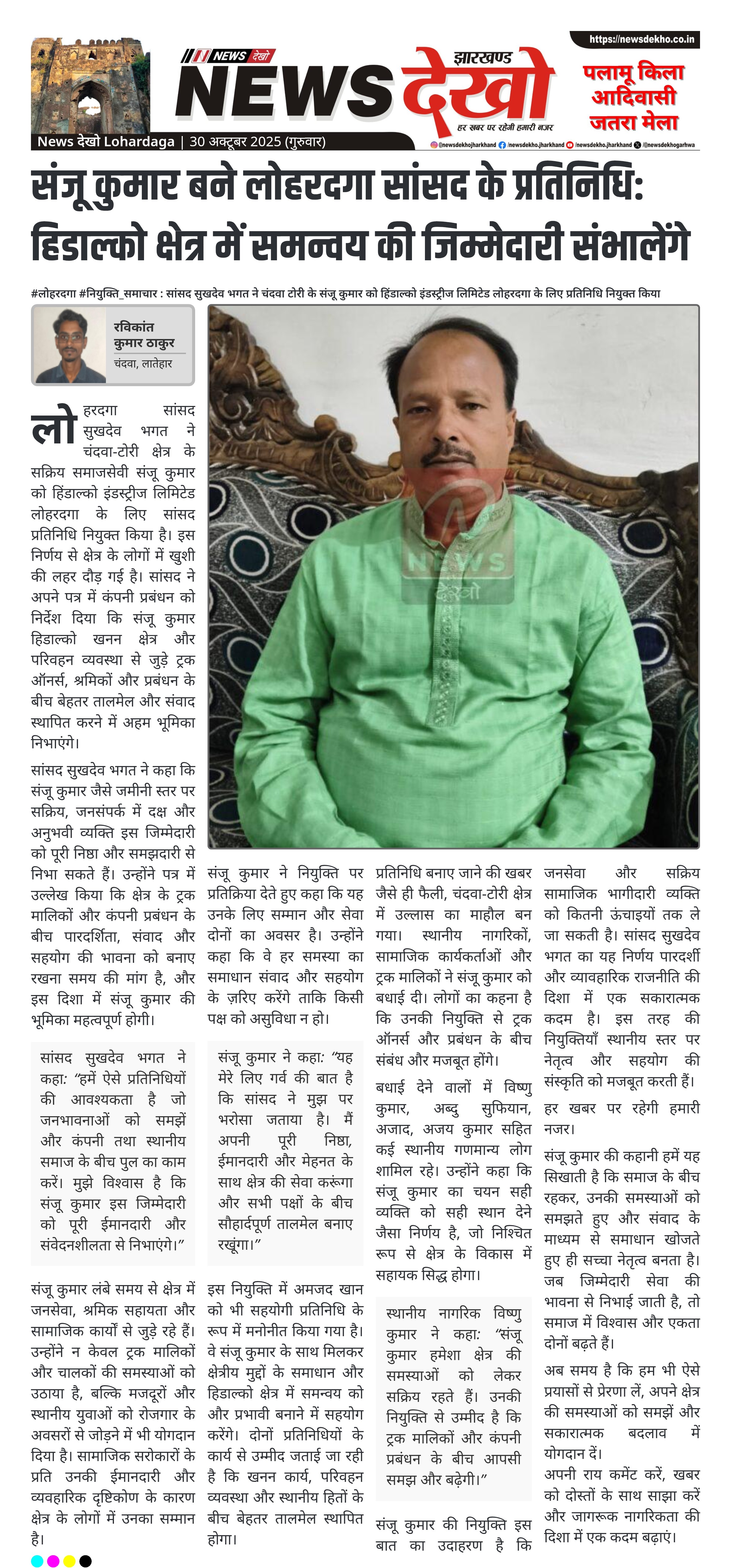 #लोहरदगा #नियुक्ति_समाचार : सांसद सुखदेव भगत ने चंदवा टोरी के संजू कुमार को हिंडाल्को इंडस्ट्रीज लिमिटेड लोहरदगा के लिए प्रतिनिधि नियुक्त किया