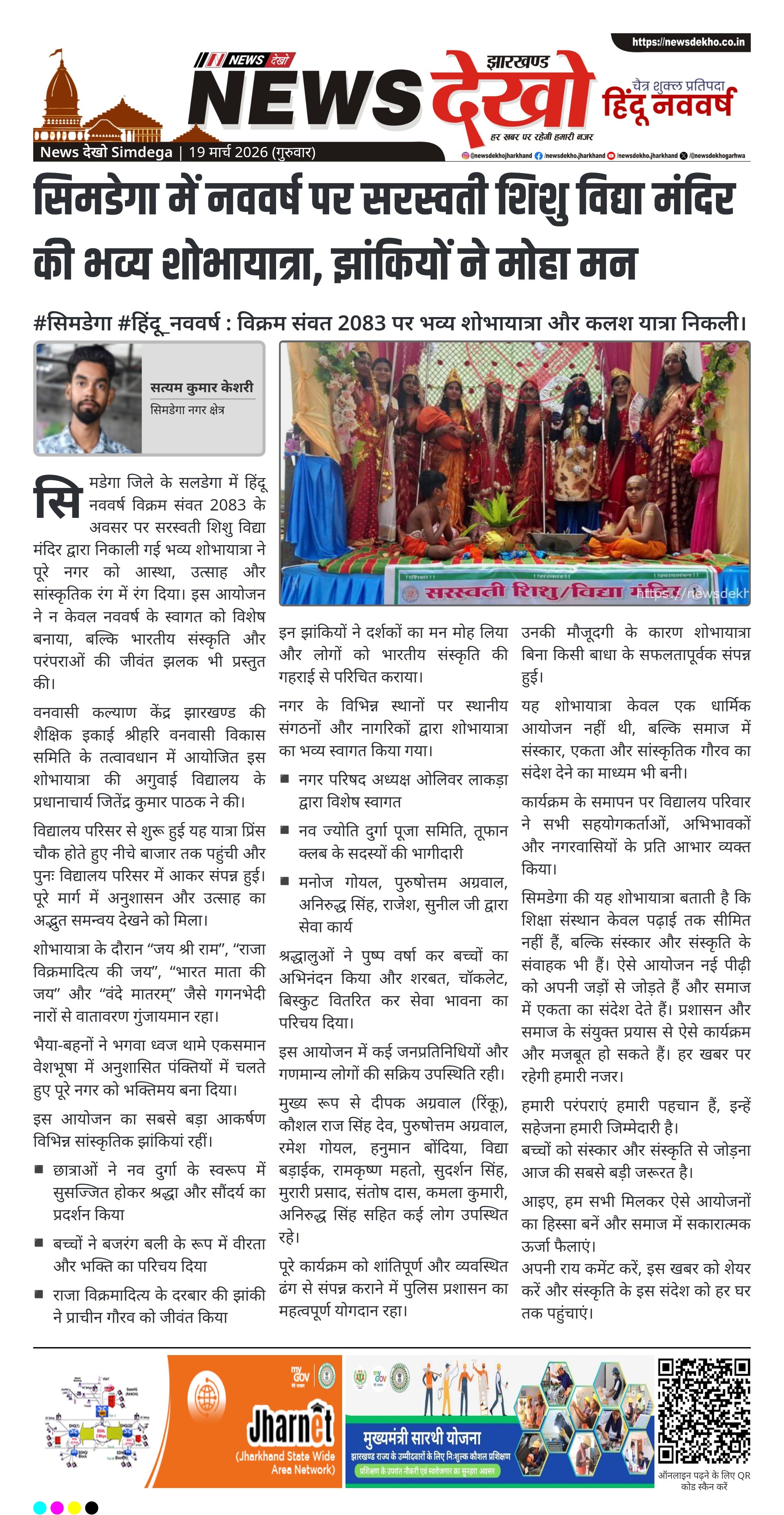 सिमडेगा के सलडेगा स्थित सरस्वती शिशु विद्या मंदिर द्वारा हिंदू नववर्ष विक्रम संवत 2083 के अवसर पर भव्य शोभायात्रा निकाली गई। विद्यालय के छात्र-छात्राओं और शिक्षकों ने उत्साहपूर्वक भाग लिया। पूरे नगर में सांस्कृतिक झांकियों और जयघोष से वातावरण भक्तिमय बना रहा। स्थानीय लोगों ने जगह-जगह स्वागत कर आयोजन को सफल बनाया।