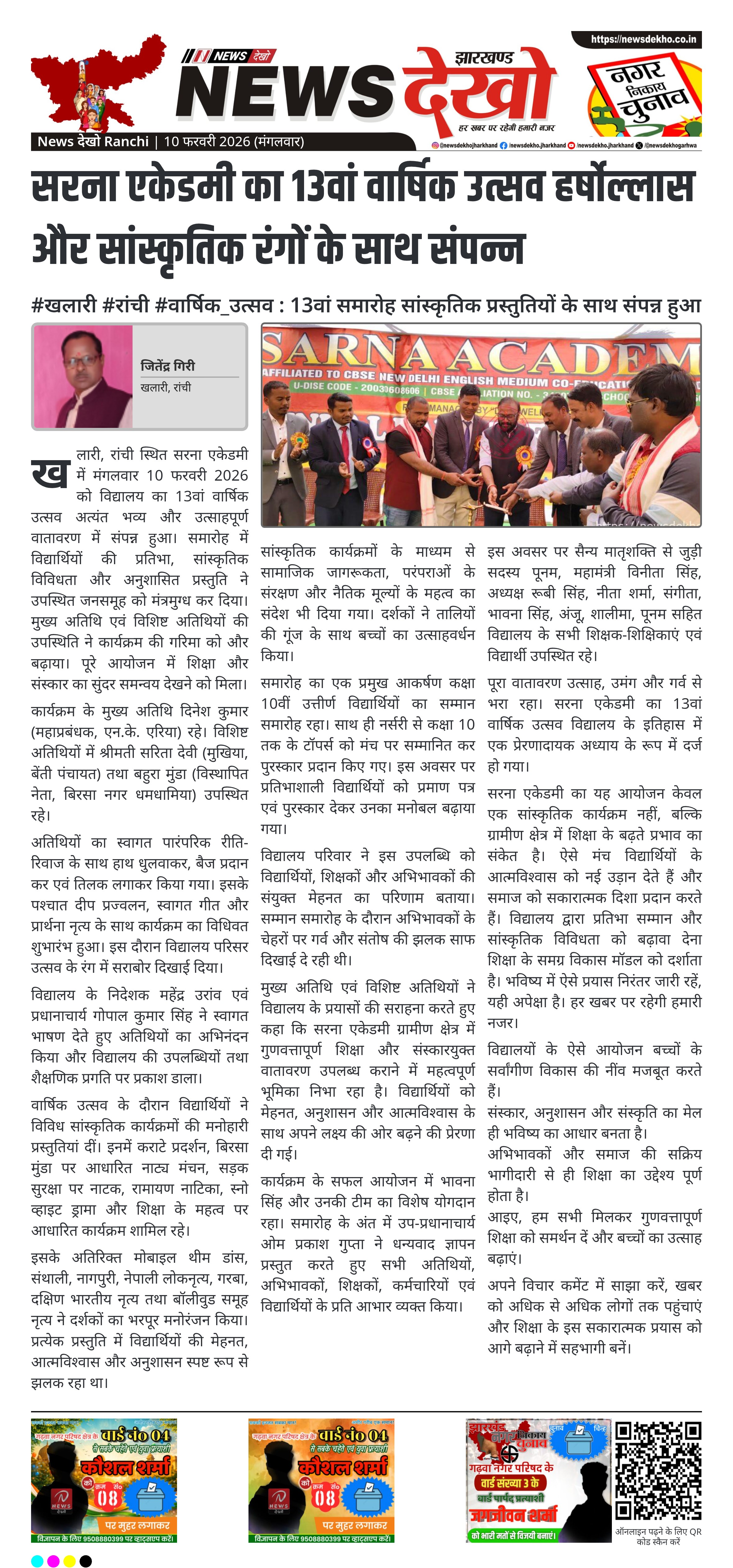 - 10 फरवरी 2026 को सरना एकेडमी, खलारी में 13वां वार्षिक उत्सव आयोजित।