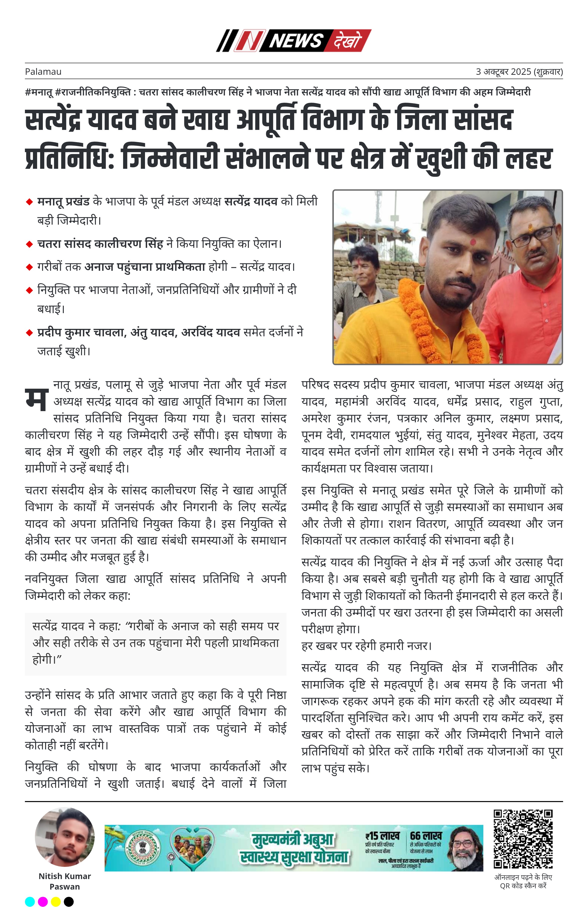 मनातू प्रखंड, पलामू से जुड़े भाजपा नेता और पूर्व मंडल अध्यक्ष सत्येंद्र यादव को खाद्य आपूर्ति विभाग का जिला सांसद प्रतिनिधि नियुक्त किया गया है। चतरा सांसद कालीचरण सिंह ने यह जिम्मेदारी उन्हें सौंपी। इस घोषणा के बाद क्षेत्र में खुशी की लहर दौड़ गई और स्थानीय नेताओं व ग्रामीणों ने उन्हें बधाई दी।