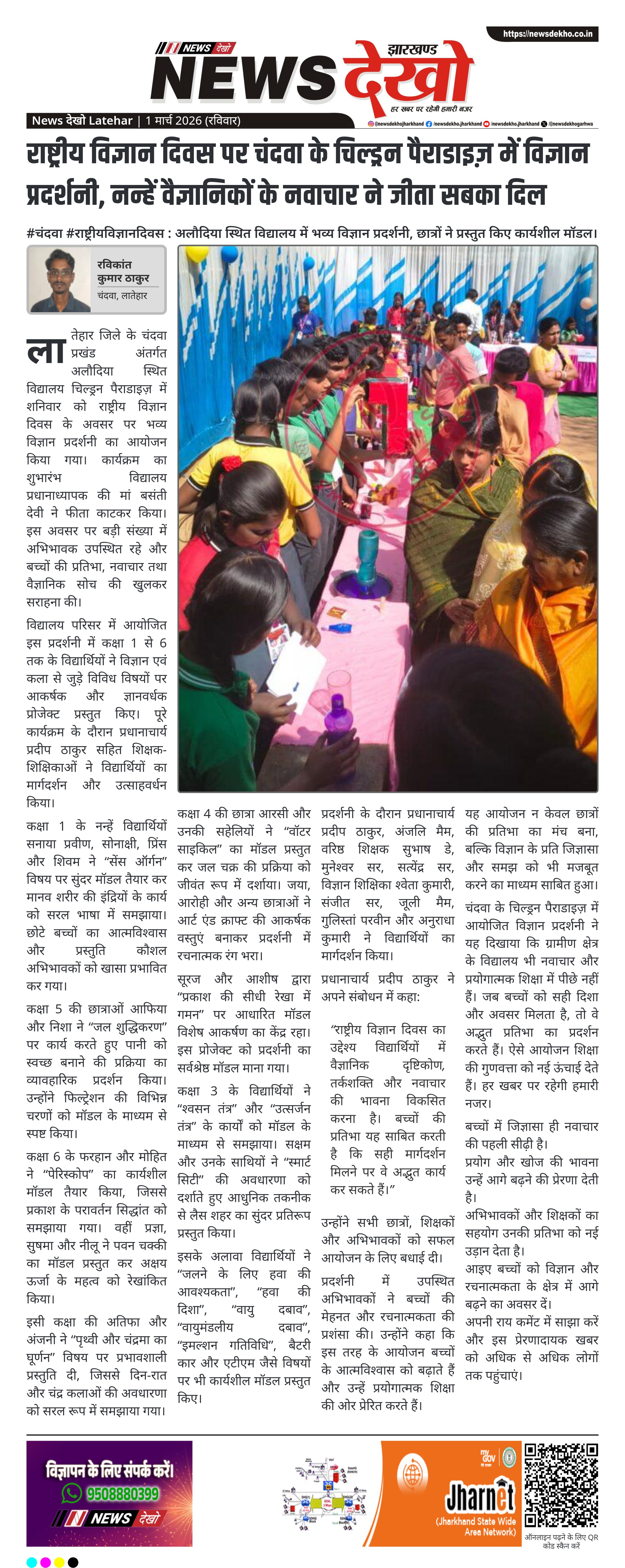 लातेहार जिले के चंदवा अंतर्गत अलौदिया स्थित चिल्ड्रन पैराडाइज़ विद्यालय में राष्ट्रीय विज्ञान दिवस के अवसर पर भव्य विज्ञान प्रदर्शनी आयोजित की गई। कक्षा 1 से 6 तक के विद्यार्थियों ने विज्ञान और कला से जुड़े कार्यशील मॉडल प्रस्तुत किए। अभिभावकों और शिक्षकों ने छात्रों की रचनात्मकता और वैज्ञानिक सोच की सराहना की। कार्यक्रम का शुभारंभ बसंती देवी ने फीता काटकर किया।