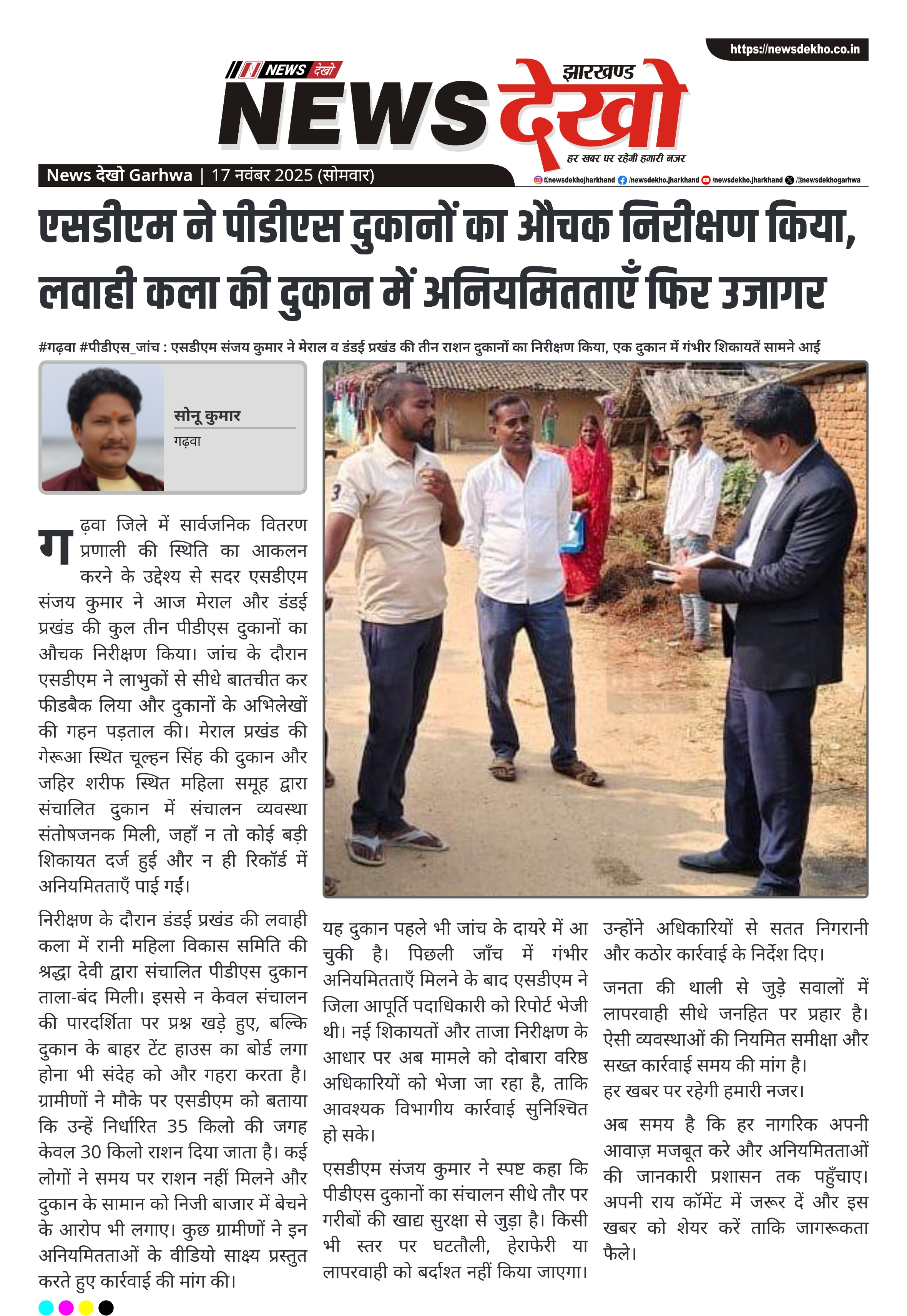 #गढ़वा #पीडीएस_जांच : एसडीएम संजय कुमार ने मेराल व डंडई प्रखंड की तीन राशन दुकानों का निरीक्षण किया, एक दुकान में गंभीर शिकायतें सामने आईं