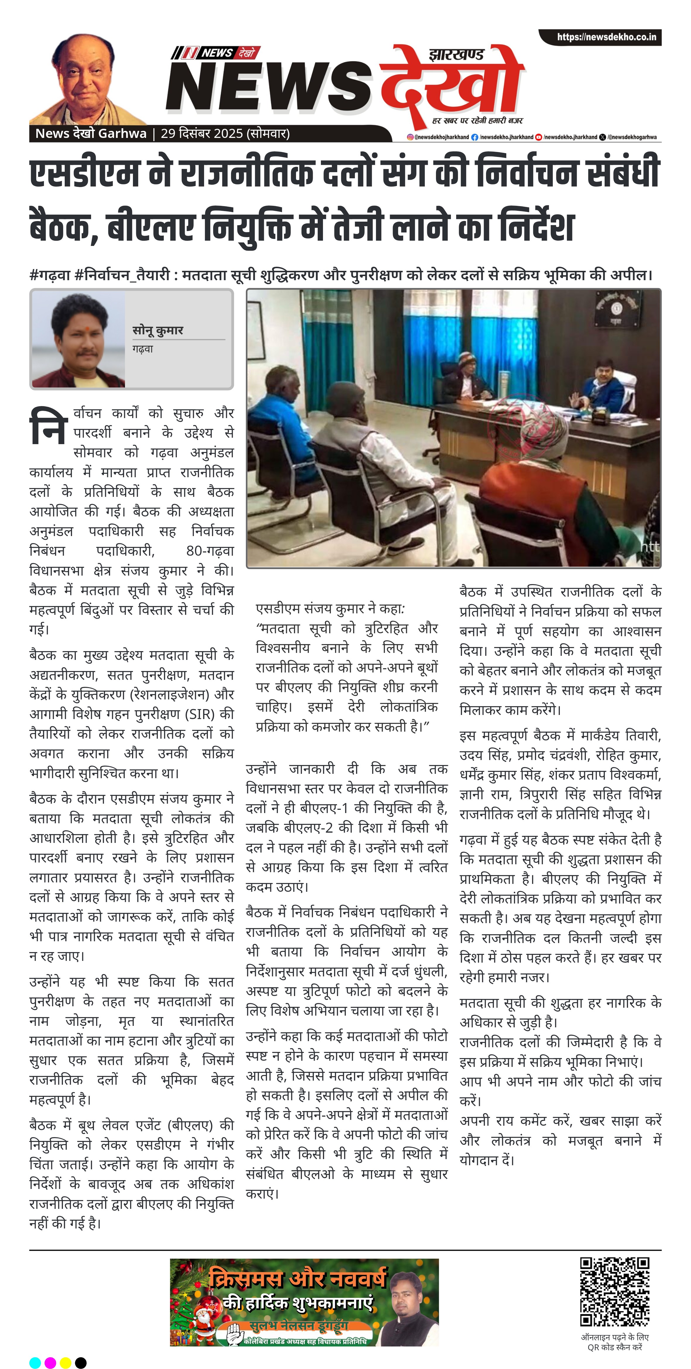 गढ़वा में हुई यह बैठक स्पष्ट संकेत देती है कि मतदाता सूची की शुद्धता प्रशासन की प्राथमिकता है। बीएलए की नियुक्ति में देरी लोकतांत्रिक प्रक्रिया को प्रभावित कर सकती है। अब यह देखना महत्वपूर्ण होगा कि राजनीतिक दल कितनी जल्दी इस दिशा में ठोस पहल करते हैं। हर खबर पर रहेगी हमारी नजर।