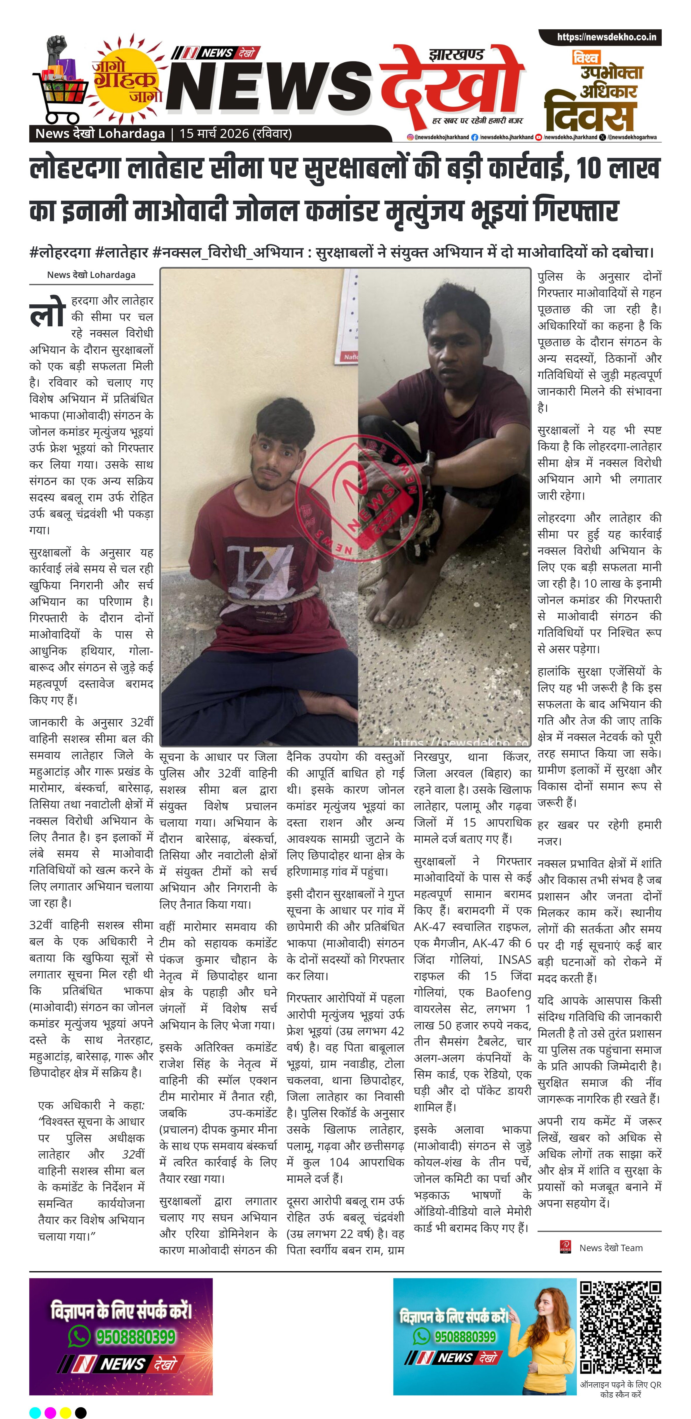 लोहरदगा और लातेहार की सीमा पर चलाए गए नक्सल विरोधी अभियान में सुरक्षाबलों को बड़ी सफलता मिली है। संयुक्त कार्रवाई में 10 लाख रुपये के इनामी भाकपा (माओवादी) जोनल कमांडर मृत्युंजय भूइयां उर्फ फ्रेश भूइयां सहित दो माओवादियों को गिरफ्तार किया गया। इनके पास से हथियार, गोला-बारूद, नकद राशि और संगठन से जुड़े कई दस्तावेज बरामद हुए हैं। पुलिस का कहना है कि गिरफ्तारी से नक्सली नेटवर्क को बड़ा झटका लगा है।