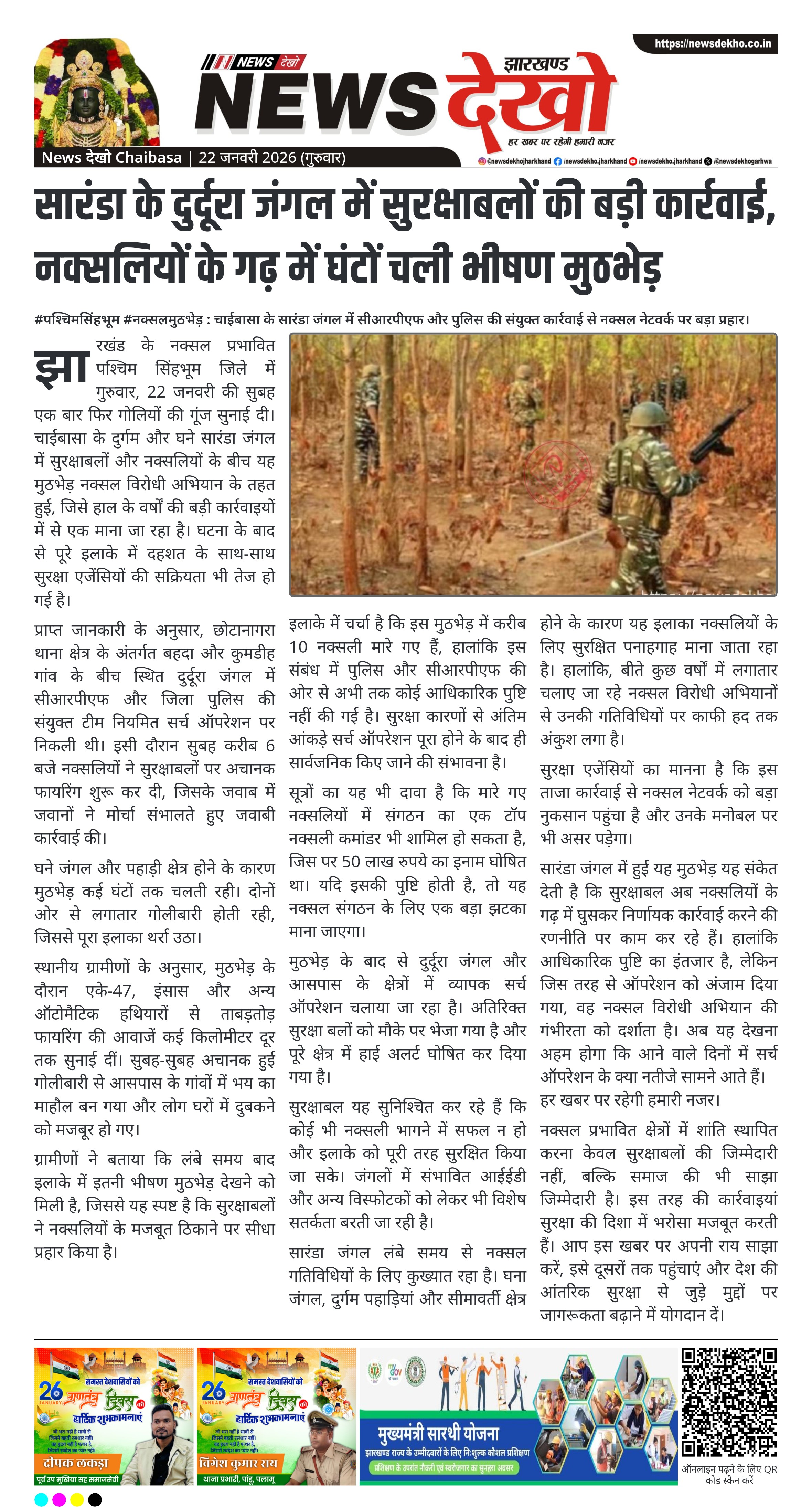 झारखंड के नक्सल प्रभावित पश्चिम सिंहभूम जिले में गुरुवार, 22 जनवरी की सुबह एक बार फिर गोलियों की गूंज सुनाई दी। चाईबासा के दुर्गम और घने सारंडा जंगल में सुरक्षाबलों और नक्सलियों के बीच यह मुठभेड़ नक्सल विरोधी अभियान के तहत हुई, जिसे हाल के वर्षों की बड़ी कार्रवाइयों में से एक माना जा रहा है। घटना के बाद से पूरे इलाके में दहशत के साथ-साथ सुरक्षा एजेंसियों की सक्रियता भी तेज हो गई है।
