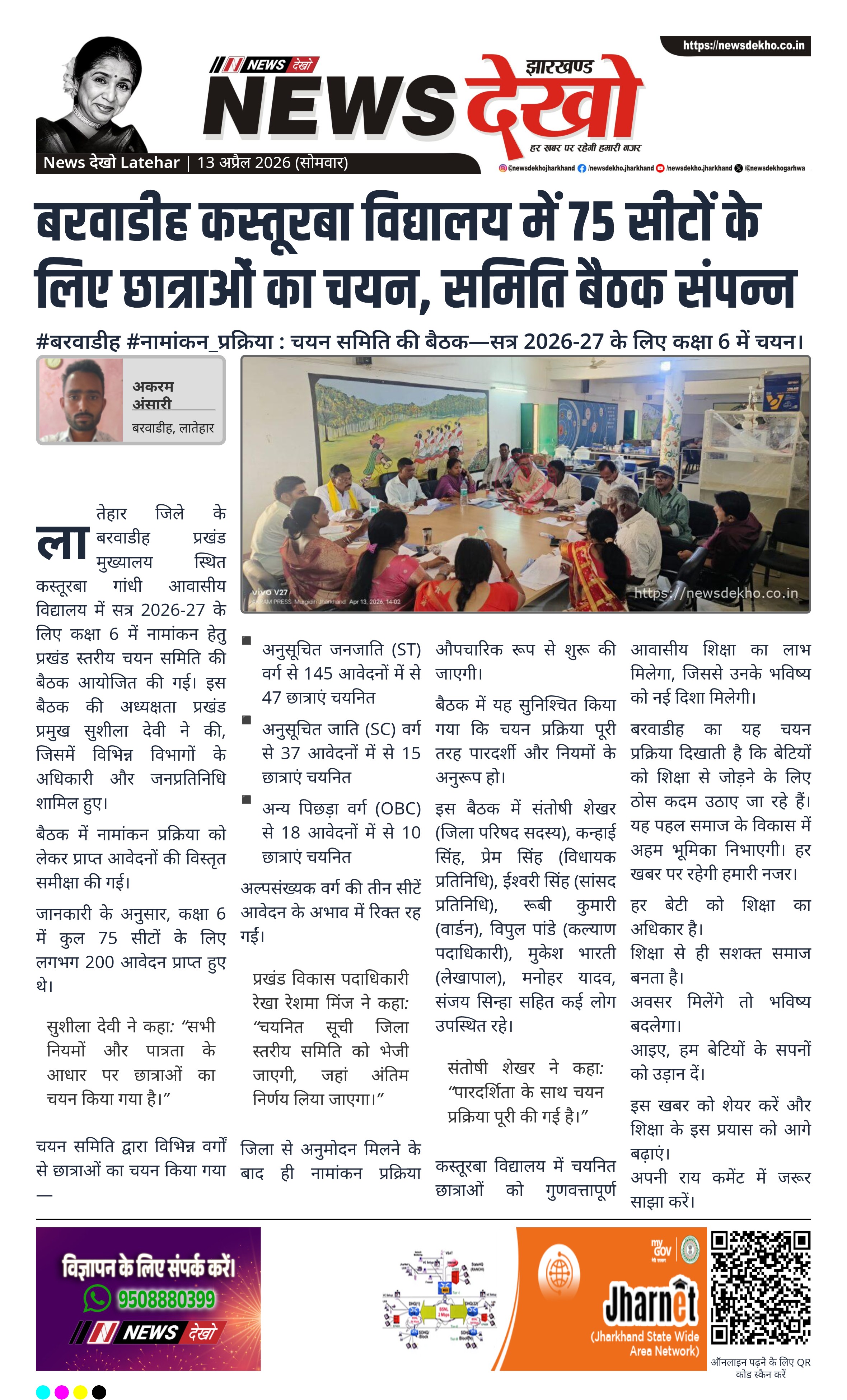 बरवाडीह का यह चयन प्रक्रिया दिखाती है कि बेटियों को शिक्षा से जोड़ने के लिए ठोस कदम उठाए जा रहे हैं। यह पहल समाज के विकास में अहम भूमिका निभाएगी। हर खबर पर रहेगी हमारी नजर।
