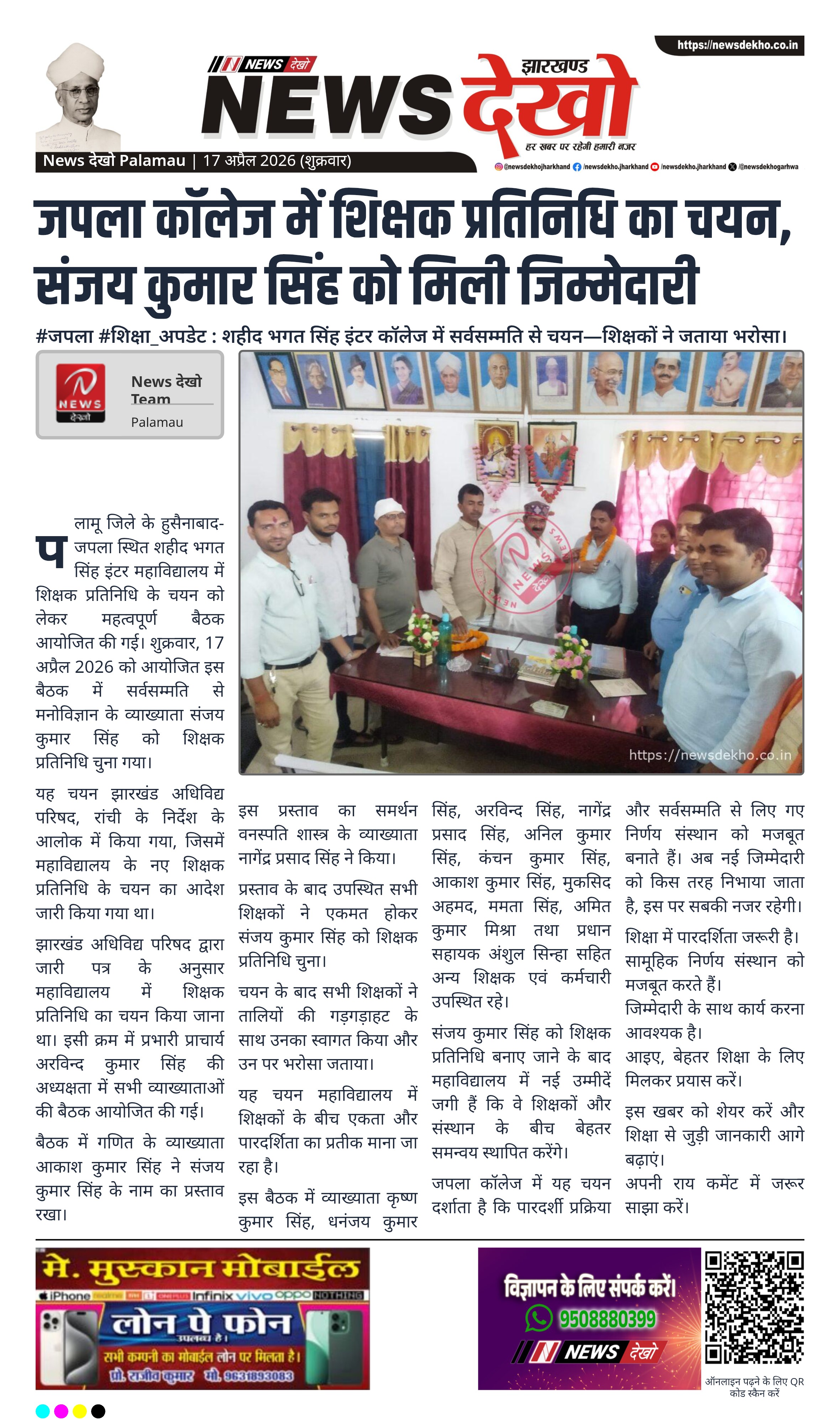 पलामू जिले के हुसैनाबाद-जपला स्थित शहीद भगत सिंह इंटर महाविद्यालय में शिक्षक प्रतिनिधि के चयन को लेकर महत्वपूर्ण बैठक आयोजित की गई। शुक्रवार, 17 अप्रैल 2026 को आयोजित इस बैठक में सर्वसम्मति से मनोविज्ञान के व्याख्याता संजय कुमार सिंह को शिक्षक प्रतिनिधि चुना गया।