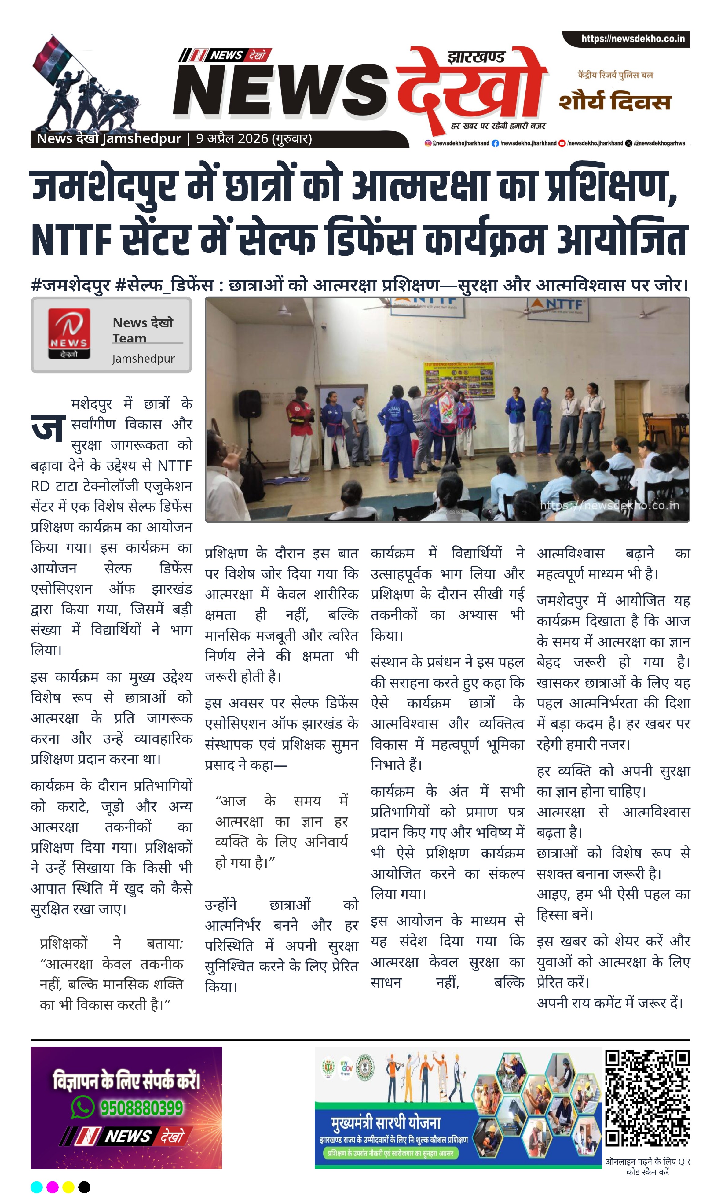 जमशेदपुर में छात्रों के सर्वांगीण विकास और सुरक्षा जागरूकता को बढ़ावा देने के उद्देश्य से NTTF RD टाटा टेक्नोलॉजी एजुकेशन सेंटर में एक विशेष सेल्फ डिफेंस प्रशिक्षण कार्यक्रम का आयोजन किया गया। इस कार्यक्रम का आयोजन सेल्फ डिफेंस एसोसिएशन ऑफ झारखंड द्वारा किया गया, जिसमें बड़ी संख्या में विद्यार्थियों ने भाग लिया।