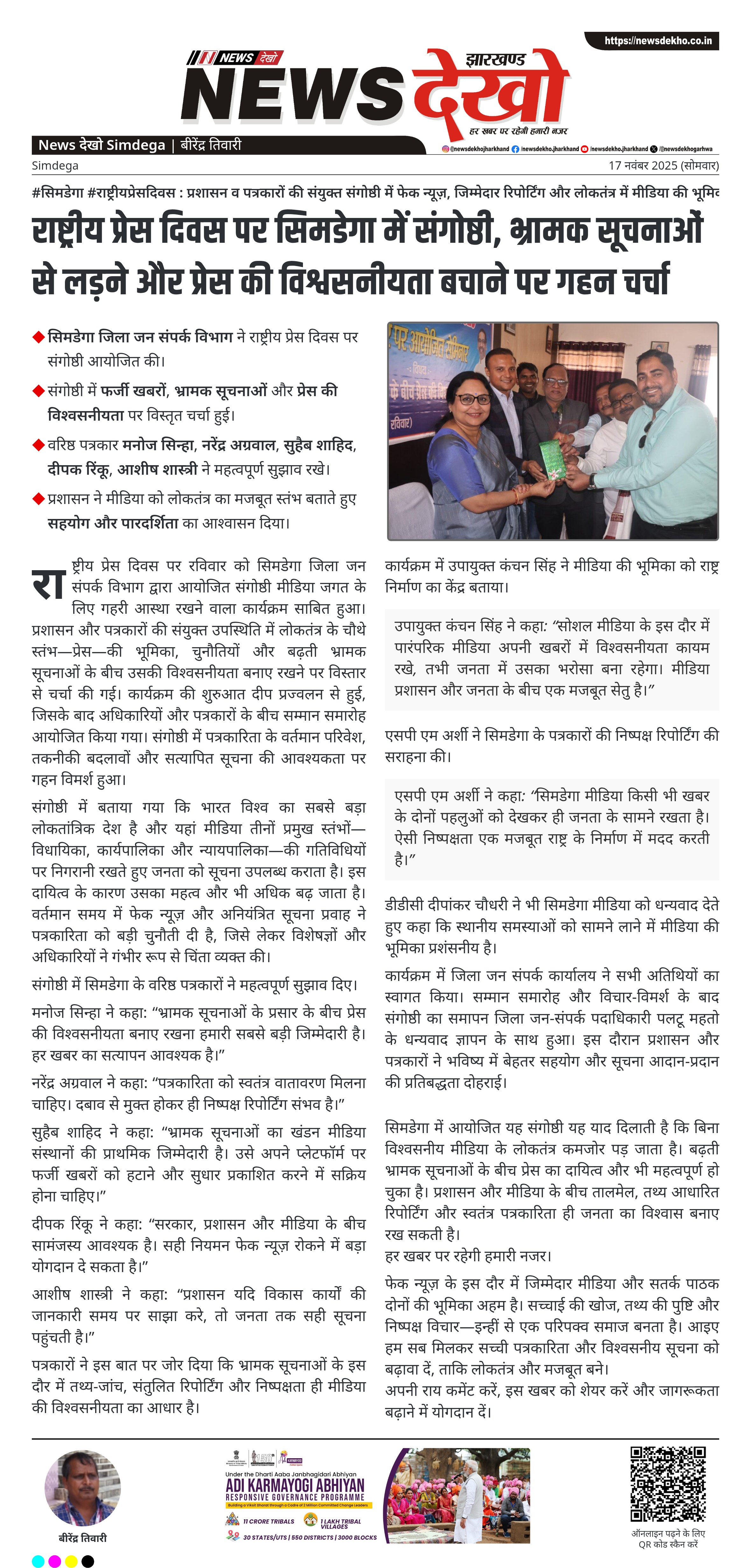 #सिमडेगा #राष्ट्रीयप्रेसदिवस : प्रशासन व पत्रकारों की संयुक्त संगोष्ठी में फेक न्यूज़, जिम्मेदार रिपोर्टिंग और लोकतंत्र में मीडिया की भूमिका पर विचार-विमर्श