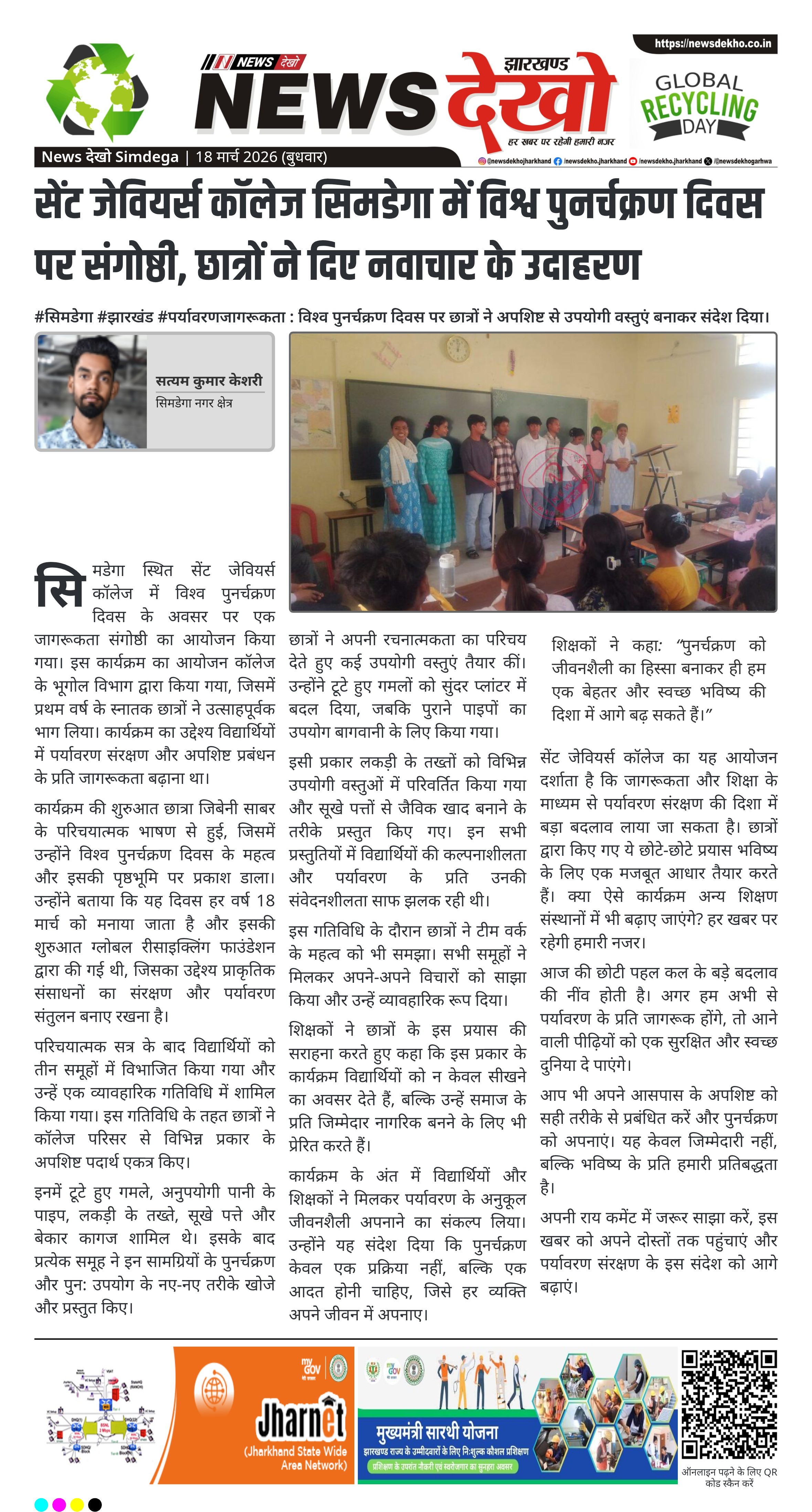 • सेंट जेवियर्स कॉलेज, सिमडेगा में मनाया गया विश्व पुनर्चक्रण दिवस।
