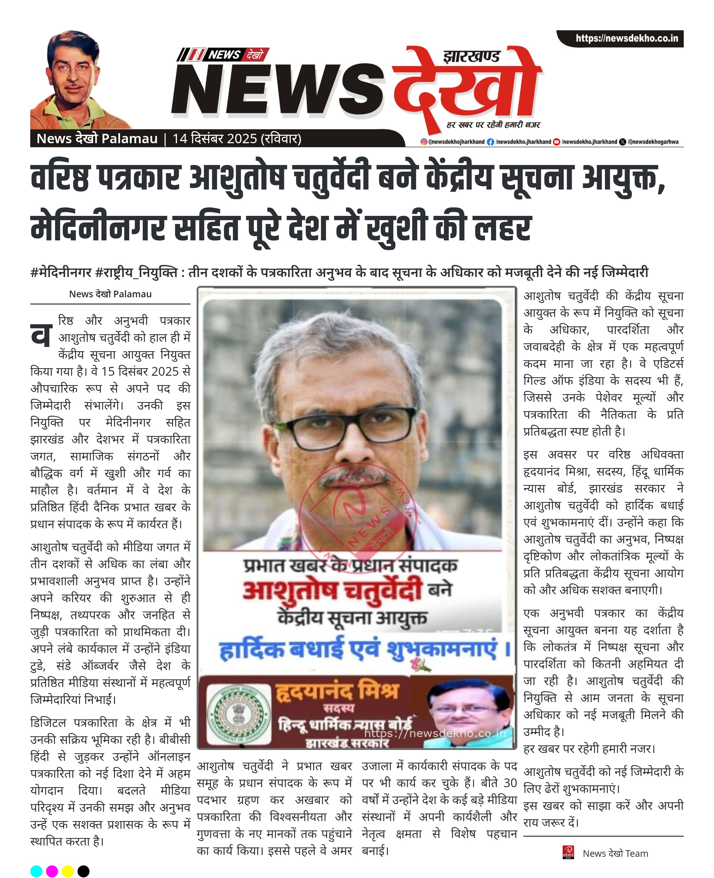 वरिष्ठ और अनुभवी पत्रकार आशुतोष चतुर्वेदी को हाल ही में केंद्रीय सूचना आयुक्त नियुक्त किया गया है। वे 15 दिसंबर 2025 से औपचारिक रूप से अपने पद की जिम्मेदारी संभालेंगे। उनकी इस नियुक्ति पर मेदिनीनगर सहित झारखंड और देशभर में पत्रकारिता जगत, सामाजिक संगठनों और बौद्धिक वर्ग में खुशी और गर्व का माहौल है। वर्तमान में वे देश के प्रतिष्ठित हिंदी दैनिक प्रभात खबर के प्रधान संपादक के रूप में कार्यरत हैं।