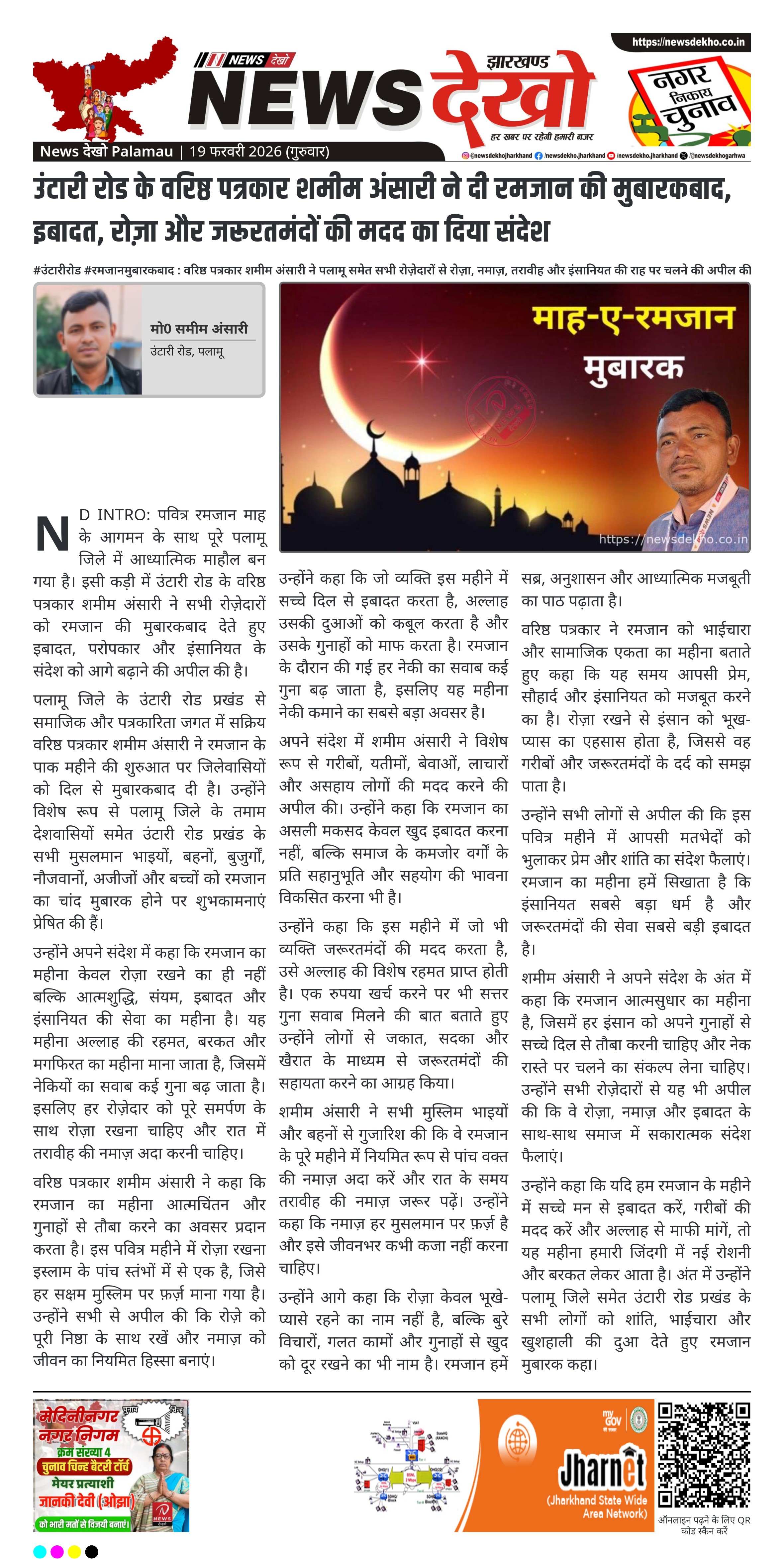 ND INTRO: पवित्र रमजान माह के आगमन के साथ पूरे पलामू जिले में आध्यात्मिक माहौल बन गया है। इसी कड़ी में उंटारी रोड के वरिष्ठ पत्रकार शमीम अंसारी ने सभी रोज़ेदारों को रमजान की मुबारकबाद देते हुए इबादत, परोपकार और इंसानियत के संदेश को आगे बढ़ाने की अपील की है।