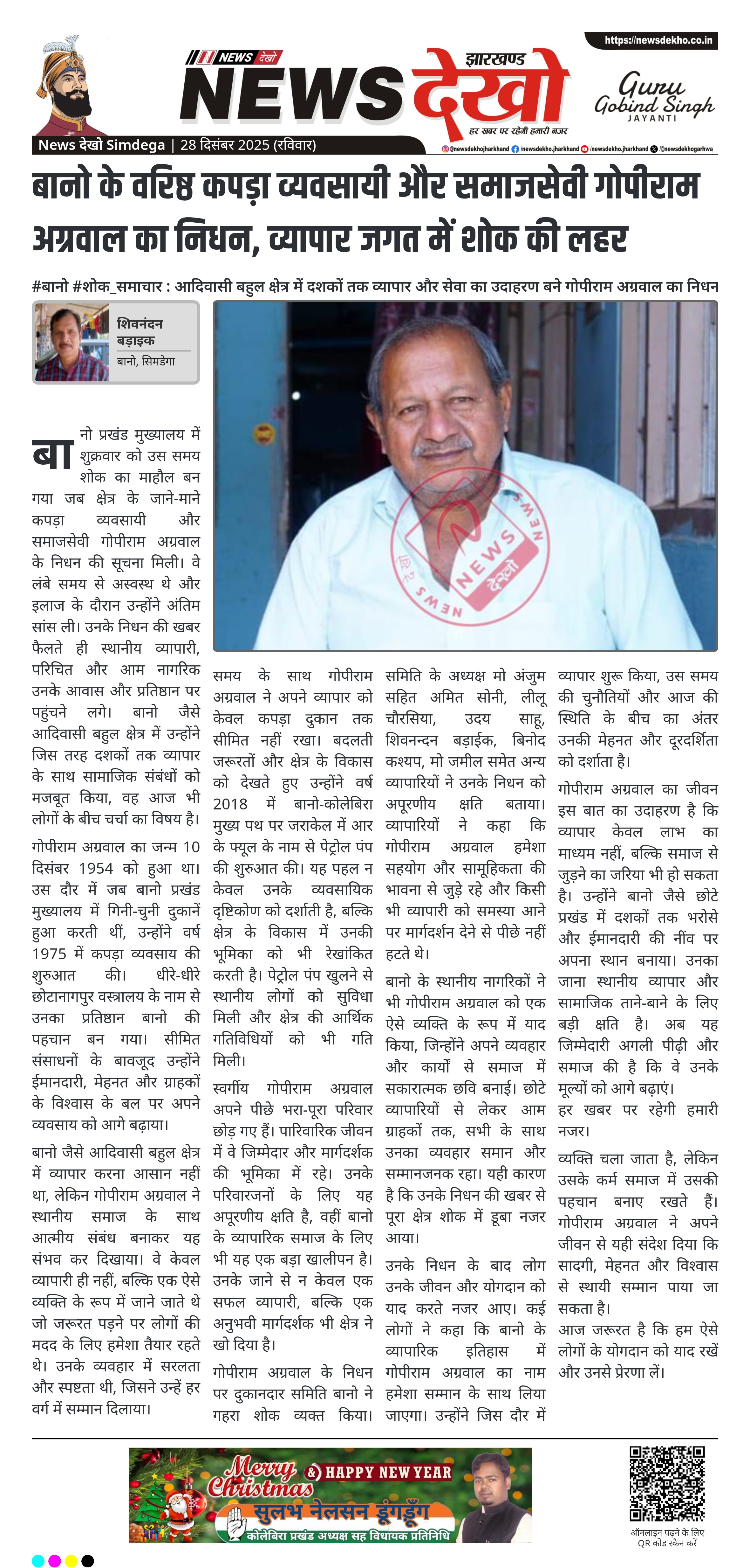 बानो प्रखंड मुख्यालय में शुक्रवार को उस समय शोक का माहौल बन गया जब क्षेत्र के जाने-माने कपड़ा व्यवसायी और समाजसेवी गोपीराम अग्रवाल के निधन की सूचना मिली। वे लंबे समय से अस्वस्थ थे और इलाज के दौरान उन्होंने अंतिम सांस ली। उनके निधन की खबर फैलते ही स्थानीय व्यापारी, परिचित और आम नागरिक उनके आवास और प्रतिष्ठान पर पहुंचने लगे। बानो जैसे आदिवासी बहुल क्षेत्र में उन्होंने जिस तरह दशकों तक व्यापार के साथ सामाजिक संबंधों को मजबूत किया, वह आज भी लोगों के बीच चर्चा का विषय है।