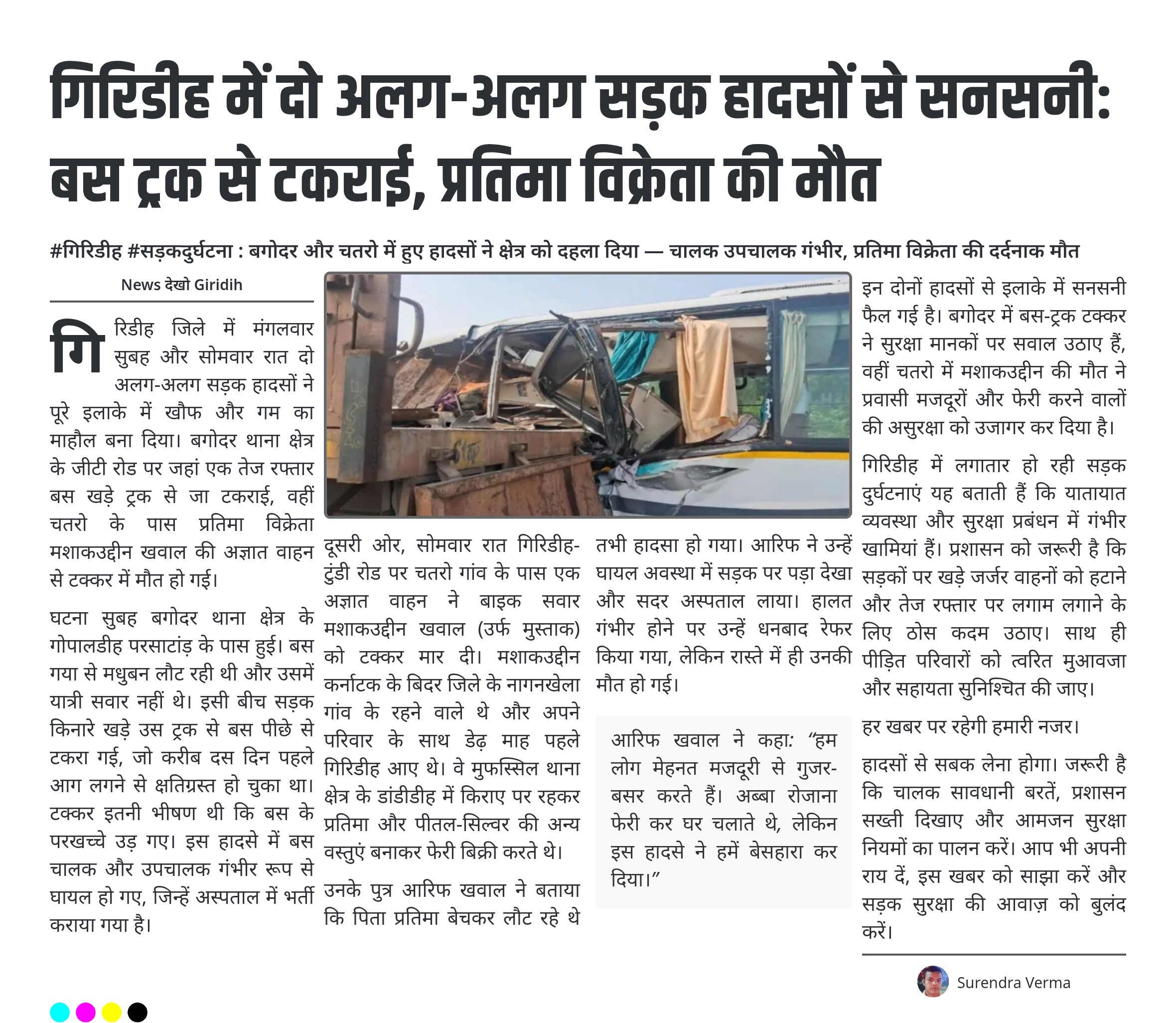 गिरिडीह में दो अलग-अलग सड़क हादसों से सनसनी: बस ट्रक से टकराई, प्रतिमा विक्रेता की मौत