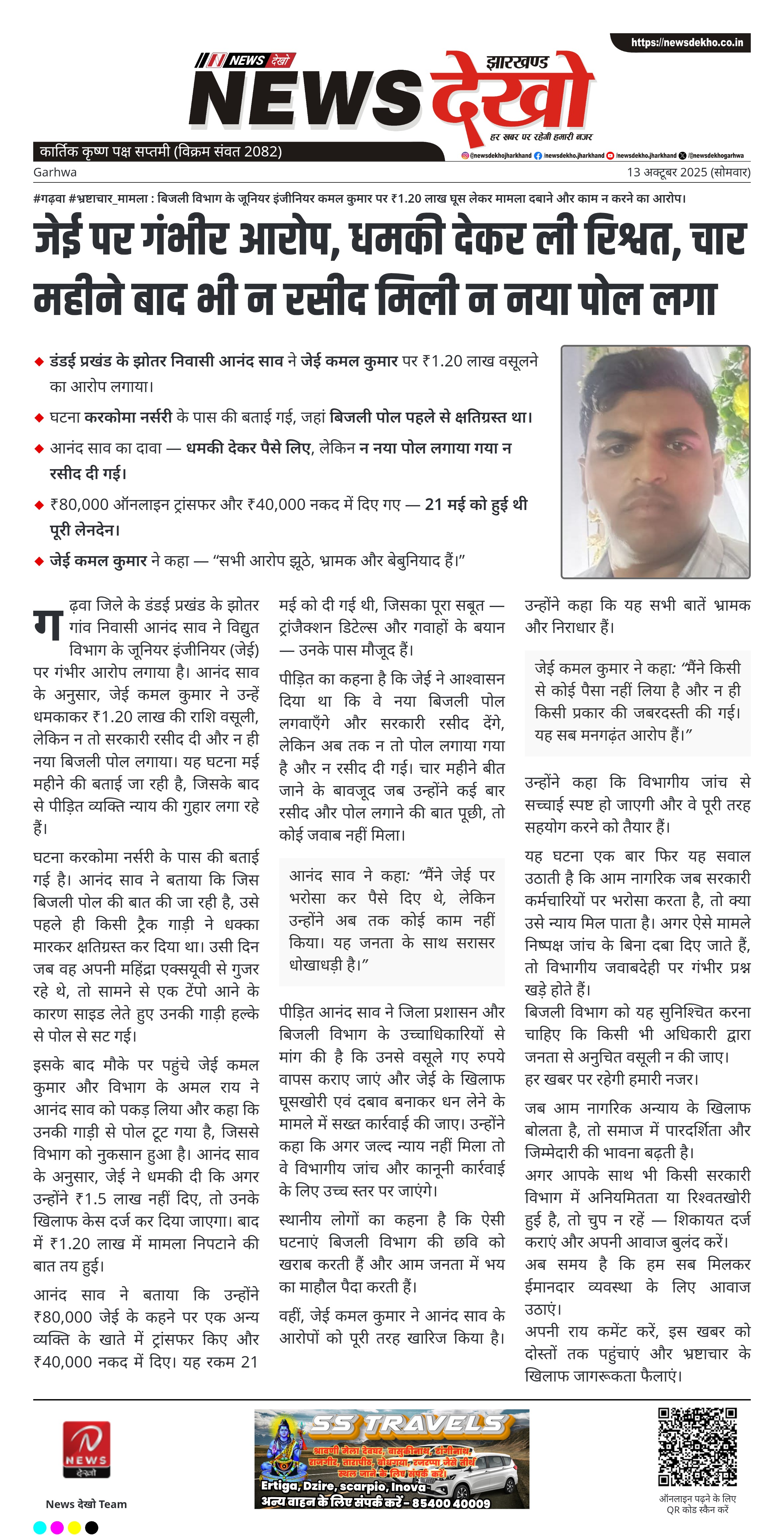 • डंडई प्रखंड के झोतर निवासी आनंद साव ने जेई कमल कुमार पर ₹1.20 लाख वसूलने का आरोप लगाया।