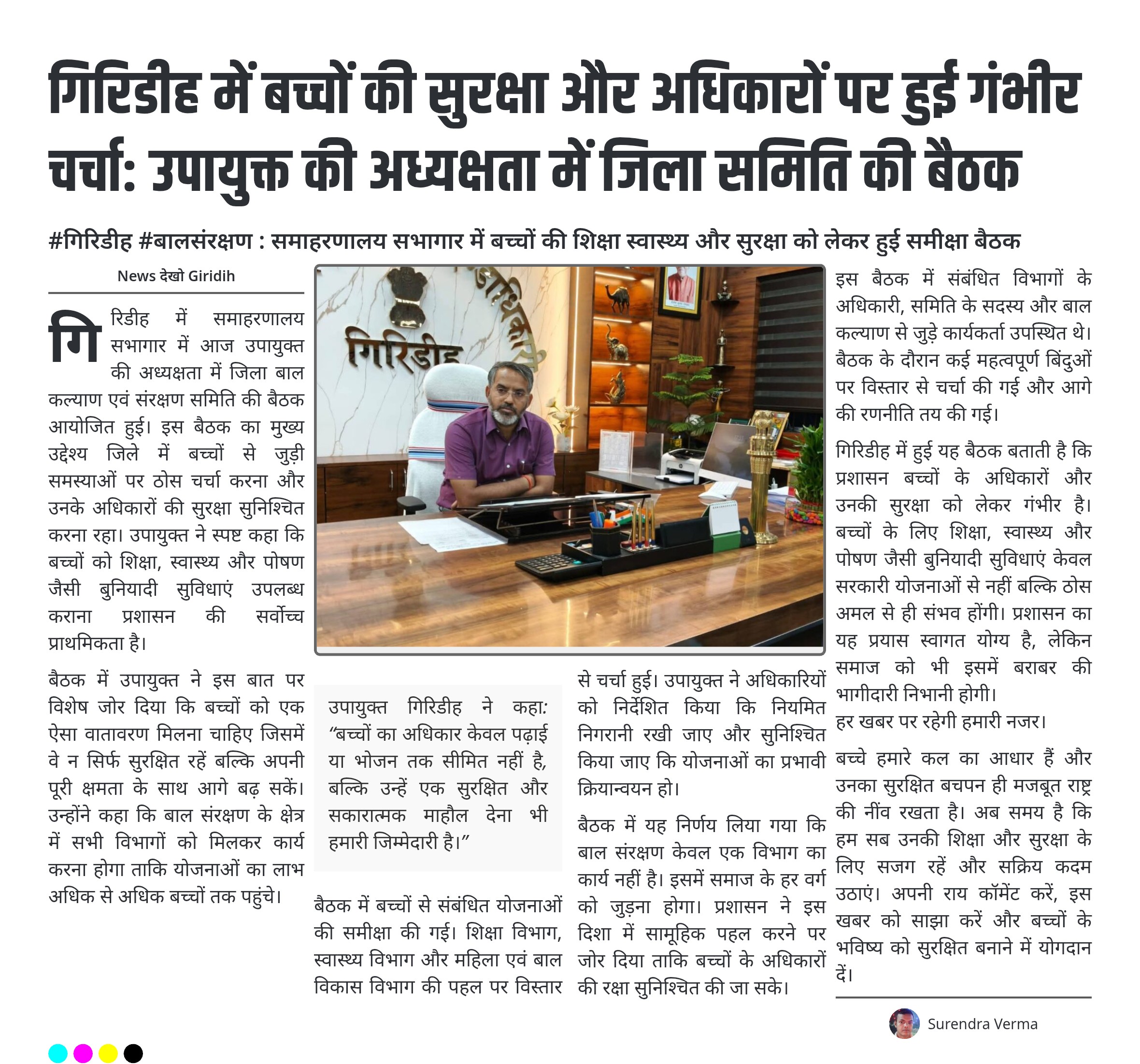 • बैठक की अध्यक्षता उपायुक्त गिरिडीह ने की और बच्चों की सुरक्षा पर बल दिया।