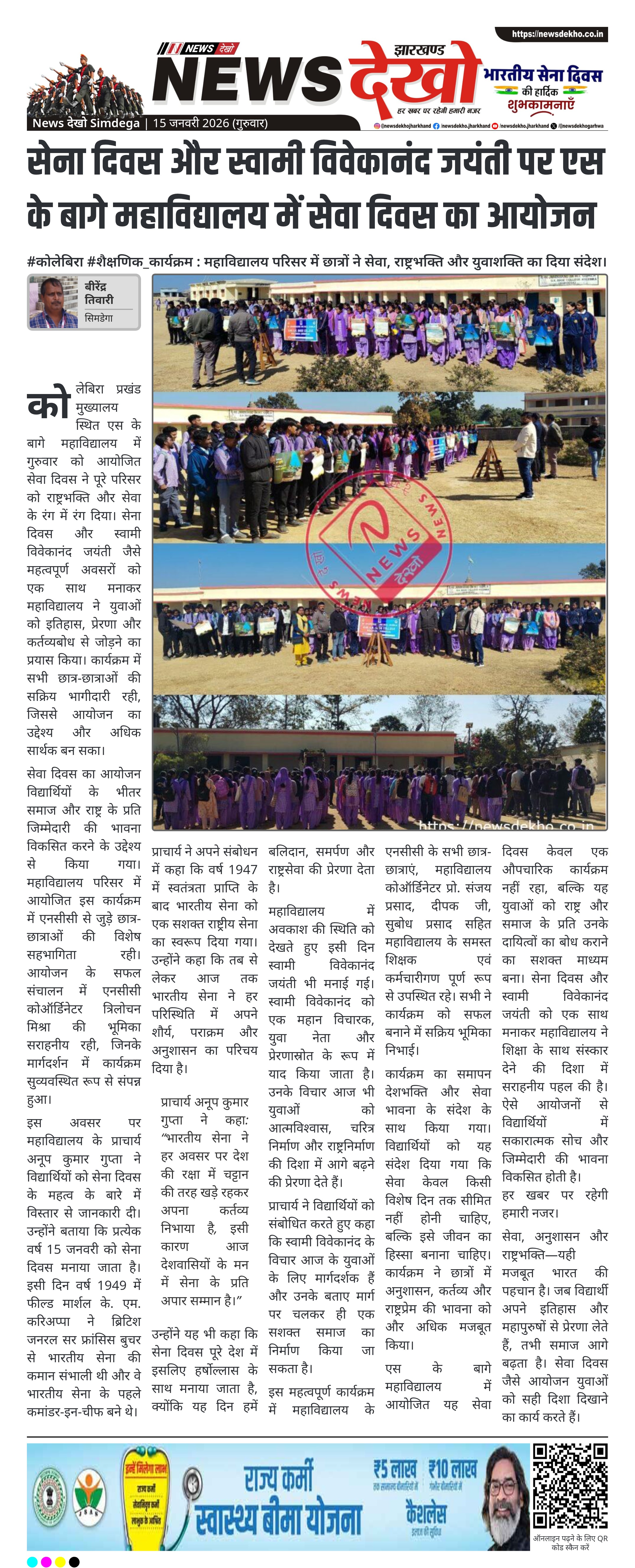 कोलेबिरा प्रखंड मुख्यालय स्थित एस के बागे महाविद्यालय में गुरुवार को आयोजित सेवा दिवस ने पूरे परिसर को राष्ट्रभक्ति और सेवा के रंग में रंग दिया। सेना दिवस और स्वामी विवेकानंद जयंती जैसे महत्वपूर्ण अवसरों को एक साथ मनाकर महाविद्यालय ने युवाओं को इतिहास, प्रेरणा और कर्तव्यबोध से जोड़ने का प्रयास किया। कार्यक्रम में सभी छात्र-छात्राओं की सक्रिय भागीदारी रही, जिससे आयोजन का उद्देश्य और अधिक सार्थक बन सका।