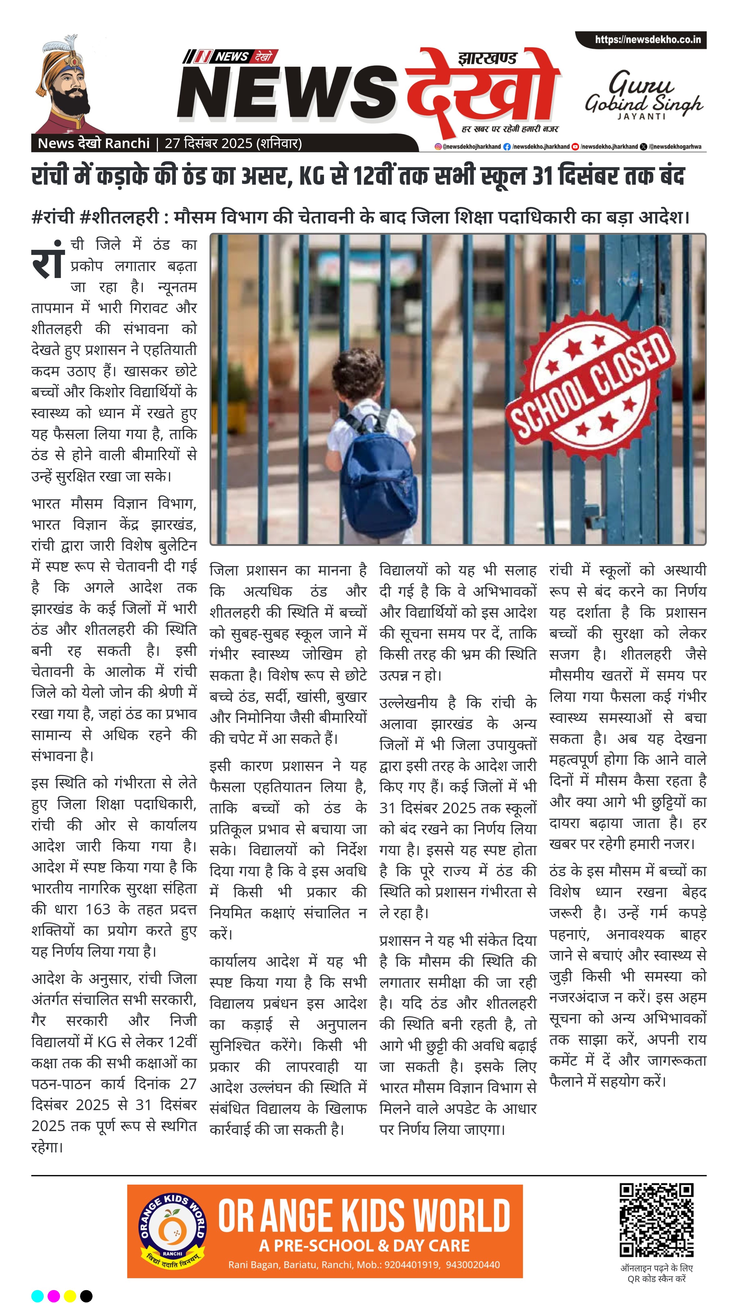 आदेश के अनुसार, रांची जिला अंतर्गत संचालित सभी सरकारी, गैर सरकारी और निजी विद्यालयों में KG से लेकर 12वीं कक्षा तक की सभी कक्षाओं का पठन-पाठन कार्य दिनांक 27 दिसंबर 2025 से 31 दिसंबर 2025 तक पूर्ण रूप से स्थगित रहेगा।