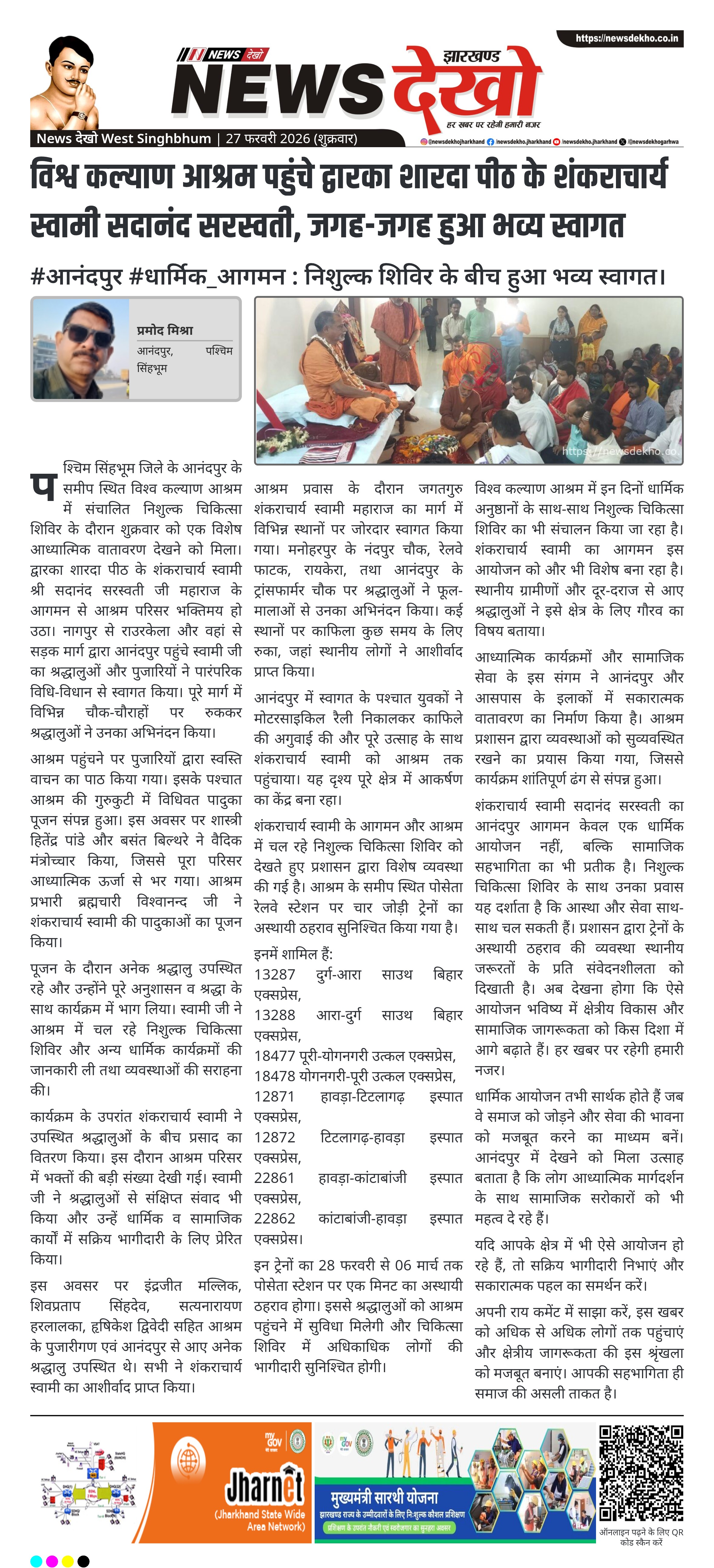 पश्चिम सिंहभूम के आनंदपुर स्थित विश्व कल्याण आश्रम में शुक्रवार शाम द्वारका शारदा पीठ के शंकराचार्य स्वामी श्री सदानंद सरस्वती जी महाराज का आगमन हुआ। नागपुर से राउरकेला होते हुए वे सड़क मार्ग से आश्रम पहुंचे, जहां वैदिक मंत्रोच्चार के बीच पादुका पूजन और स्वागत समारोह आयोजित किया गया। मनोहरपुर से आनंदपुर तक कई स्थानों पर श्रद्धालुओं ने उनका अभिनंदन किया। उनके आगमन को देखते हुए पोसेता स्टेशन पर चार जोड़ी ट्रेनों का अस्थायी ठहराव भी निर्धारित किया गया है।