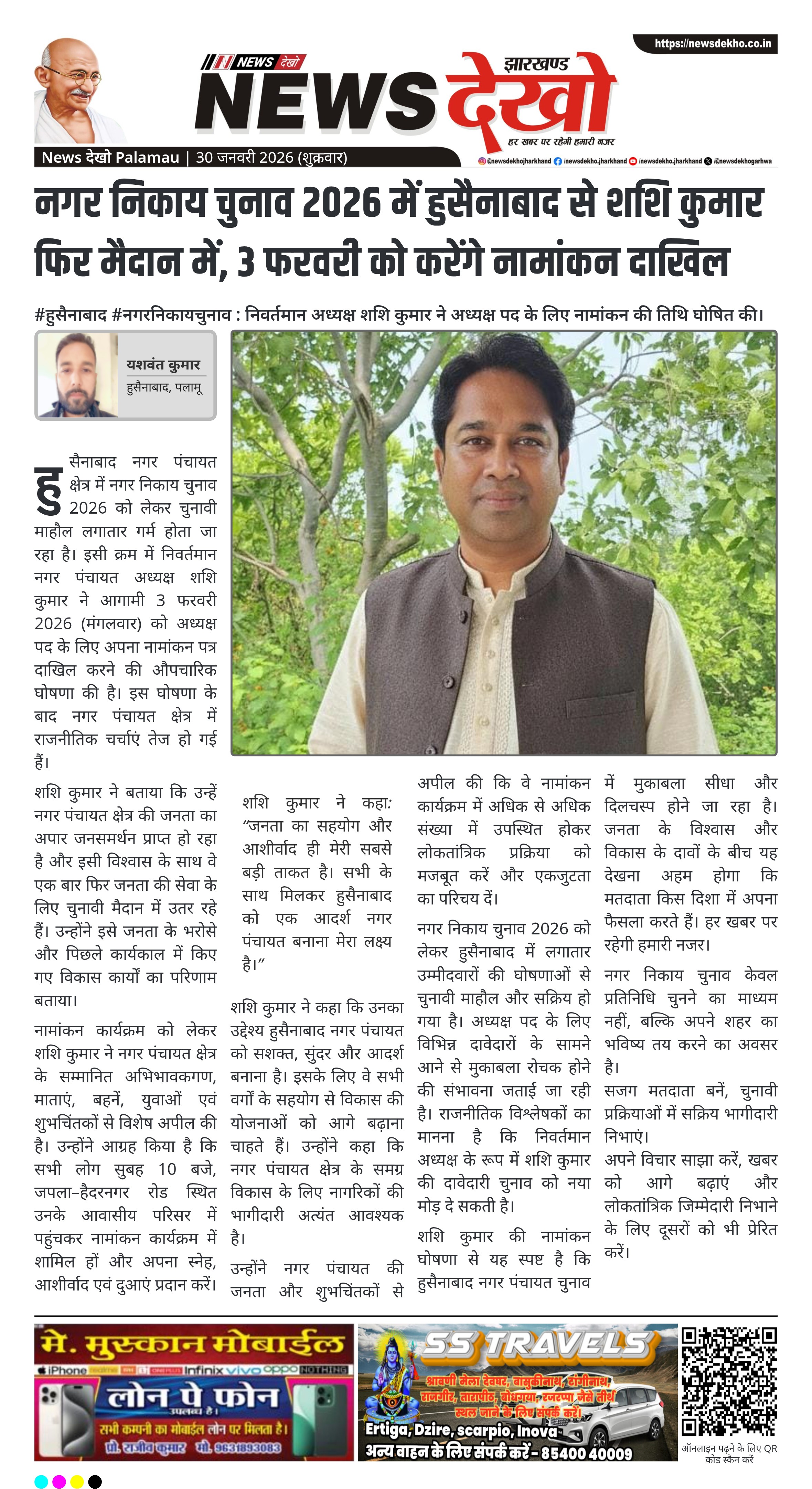 हुसैनाबाद नगर पंचायत क्षेत्र में नगर निकाय चुनाव 2026 को लेकर चुनावी माहौल लगातार गर्म होता जा रहा है। इसी क्रम में निवर्तमान नगर पंचायत अध्यक्ष शशि कुमार ने आगामी 3 फरवरी 2026 (मंगलवार) को अध्यक्ष पद के लिए अपना नामांकन पत्र दाखिल करने की औपचारिक घोषणा की है। इस घोषणा के बाद नगर पंचायत क्षेत्र में राजनीतिक चर्चाएं तेज हो गई हैं।